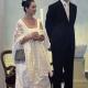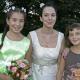 Photo de la robe de mariée de Cécile : Bustier avec un empiècement de dentelle sur le devant. Bas de la robe avec egalement un empiecement central sur le devant. A la taille, ceinture et ruban en soie sauvage vert mousse. Etole en dentelle.