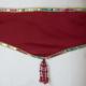 Zoom sur la jupe : superpositions d'une jupe courte en tissu satiné bordeaux et d'une jupe longue fendue sur les côtés en tissu ajouré bordeaux et doré. Taille élastiquée.
