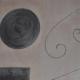 Tableau bordeaux et gris, carrés et arabesques.