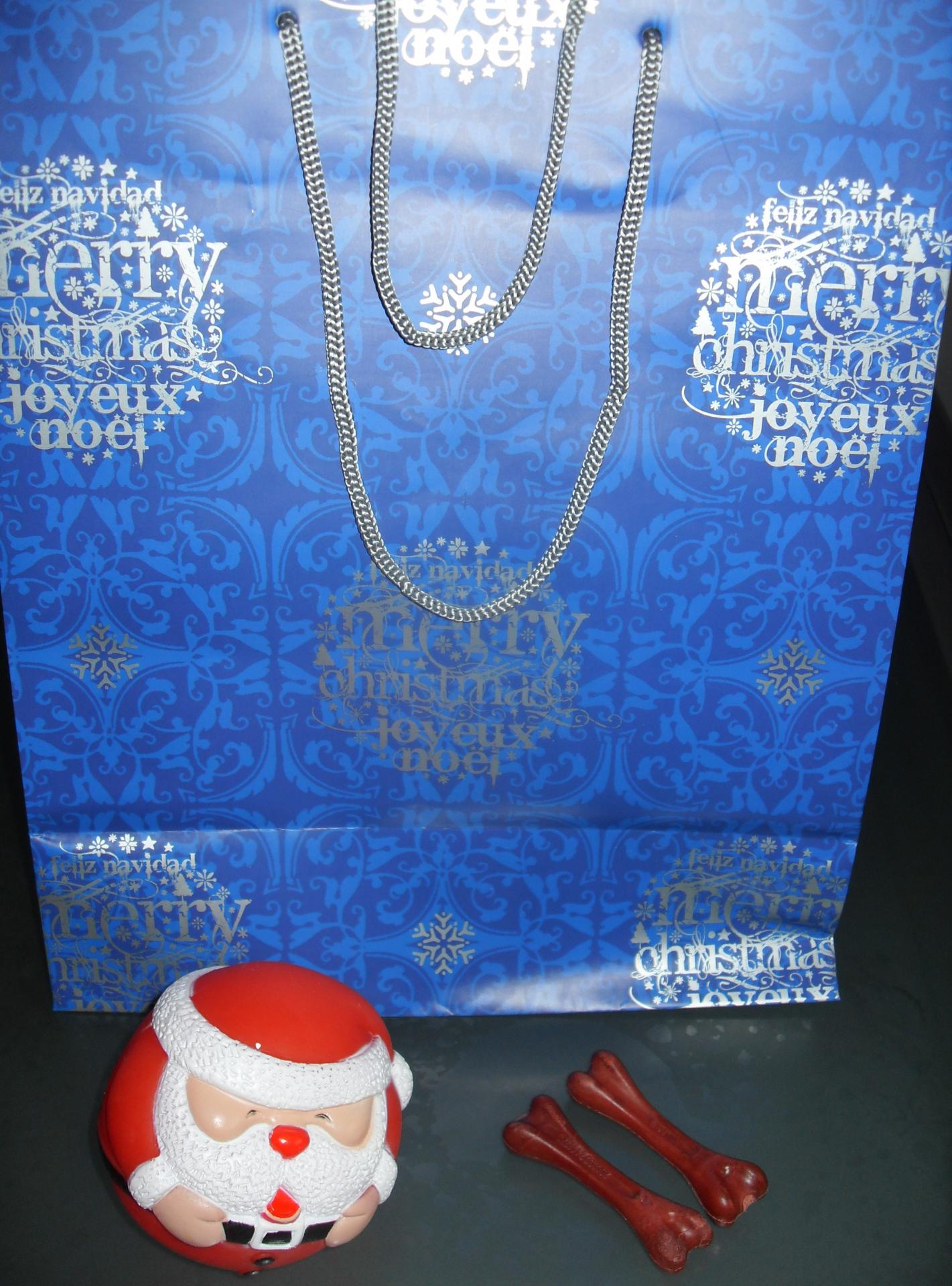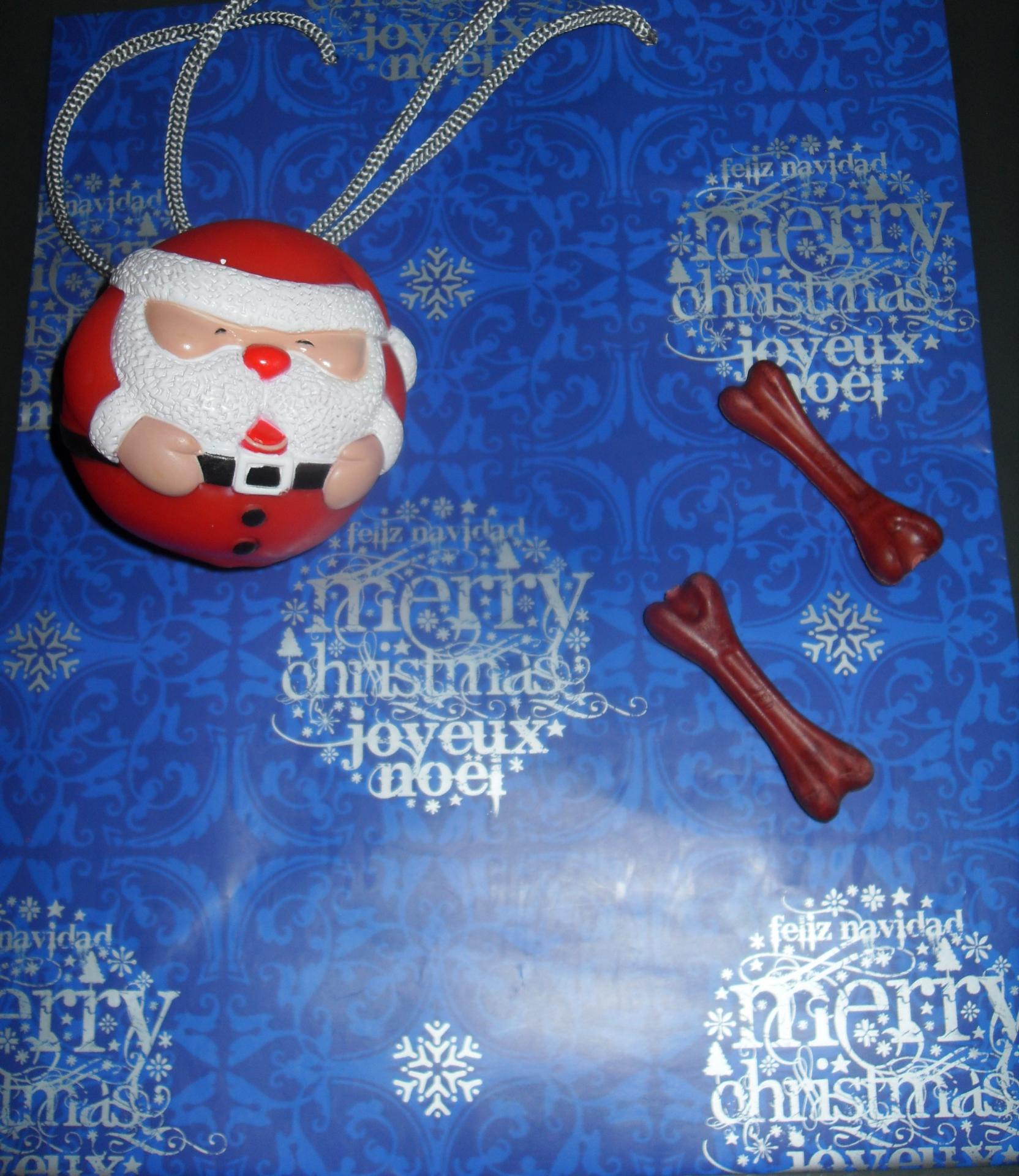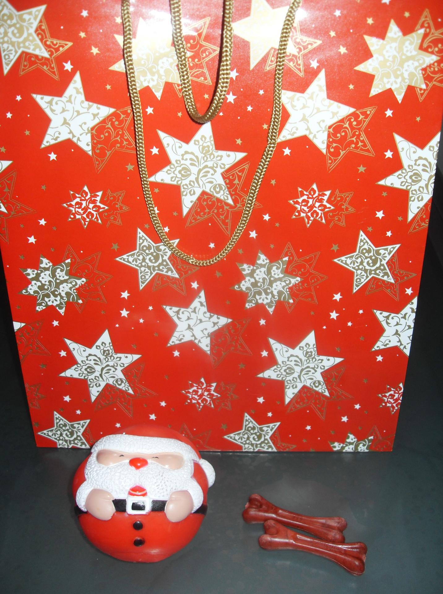 comprend un sac cadeau, une balle père-noël qui fait du bruit et 2 petits gâteaux en forme d'os.