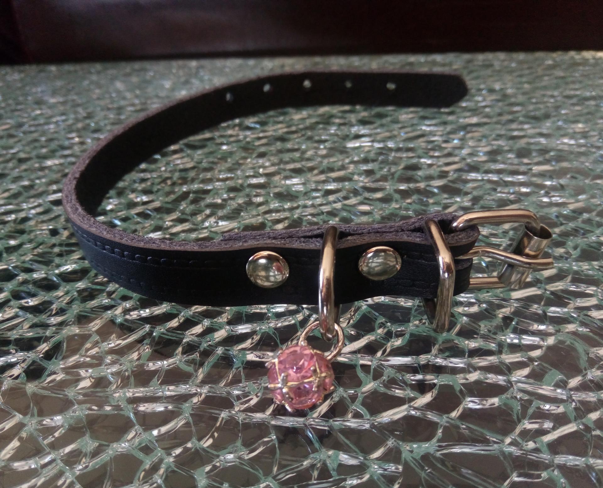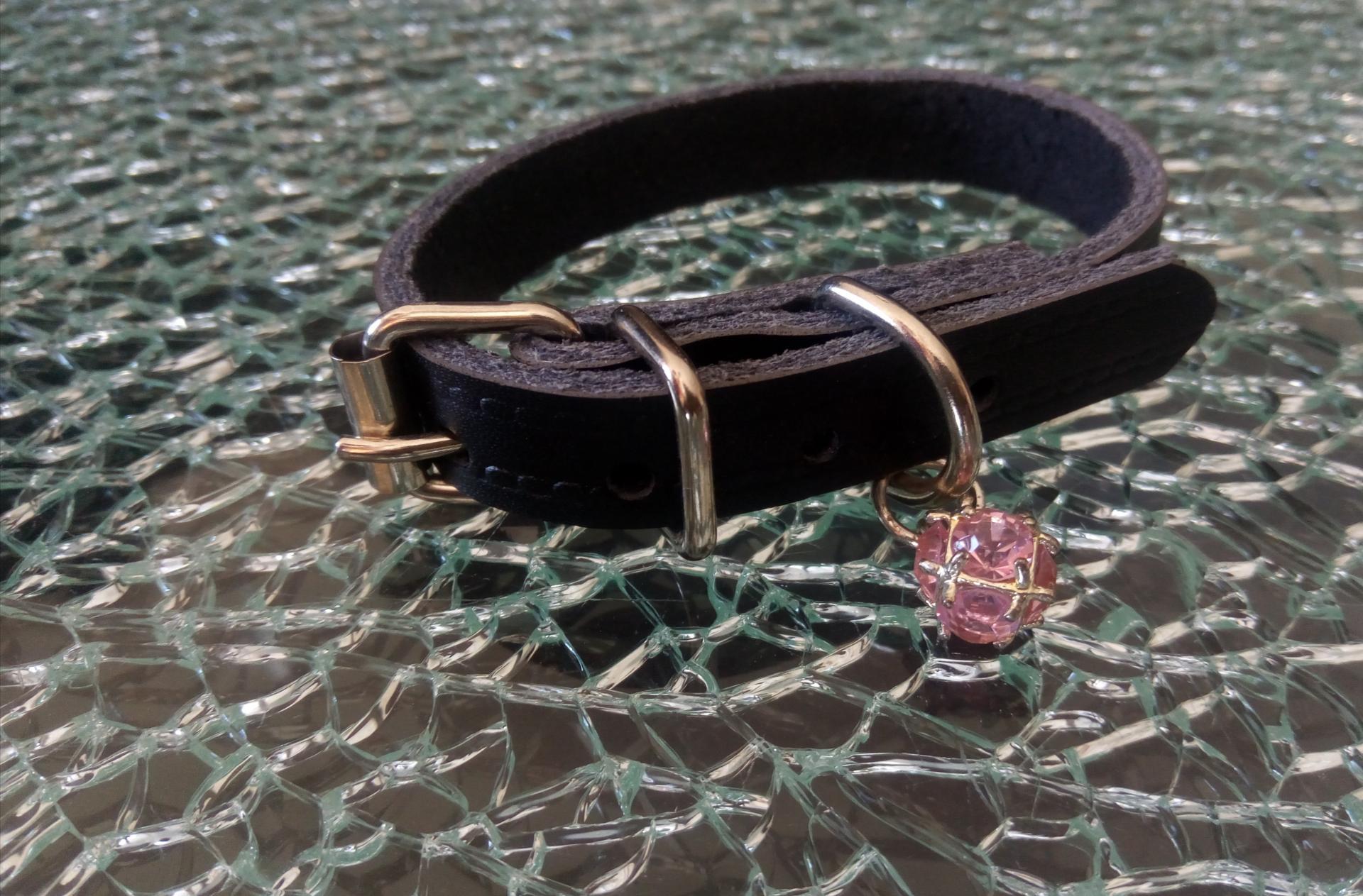 Collier cuir noir et perle strass rose pour chien, chiot, chat.