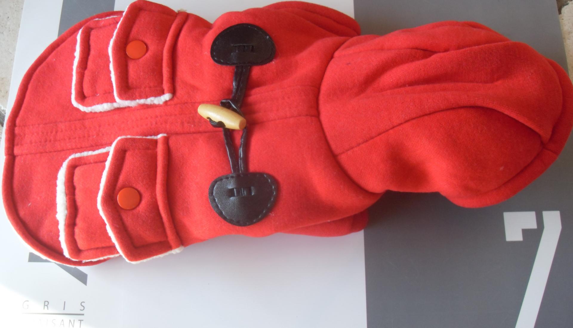 Vêtement chien, manteau duffle coat rouge et capuche.