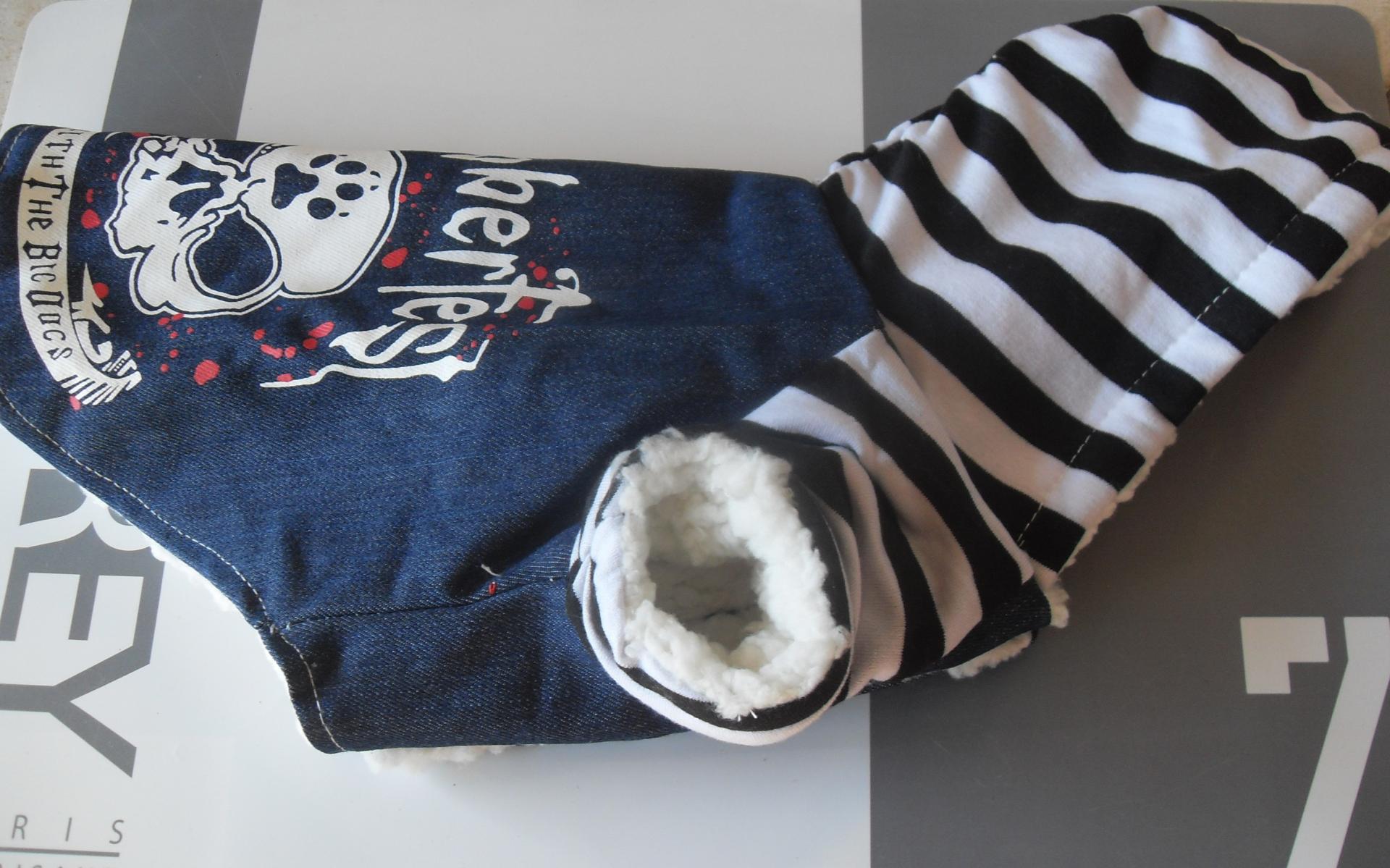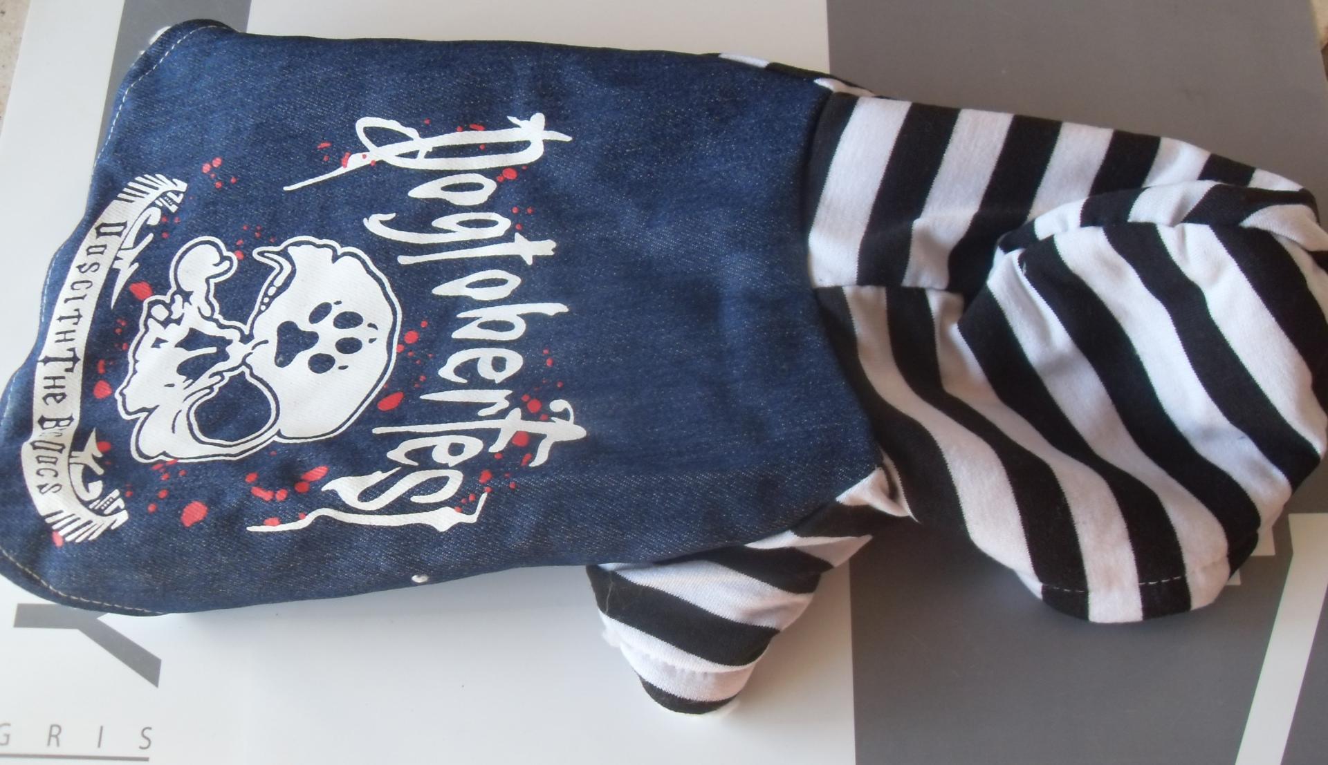 Vêtement chien, manteau sweat-jeans, tête de mort et capuche.