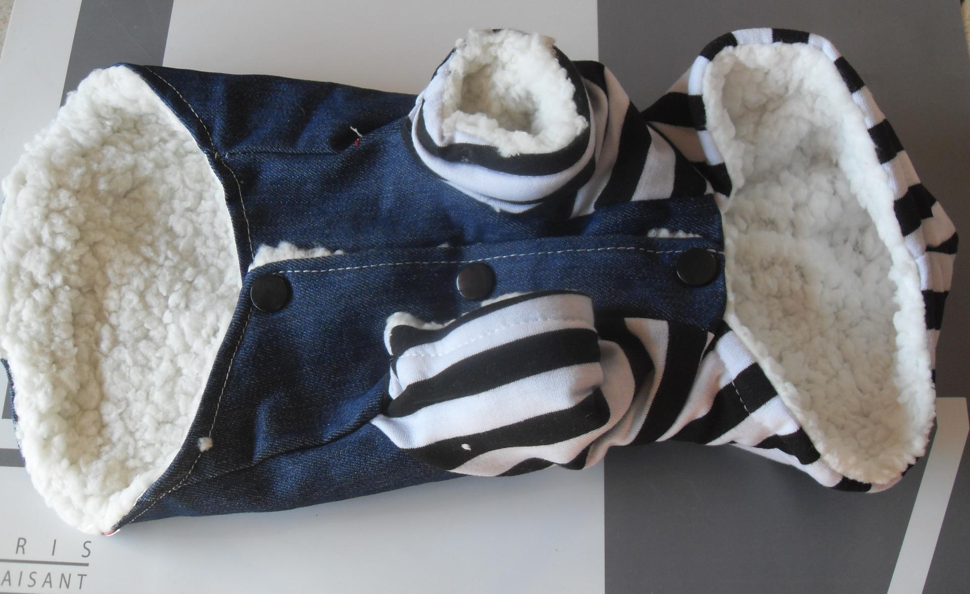 Vêtement chien, manteau sweat-jeans et capuche.