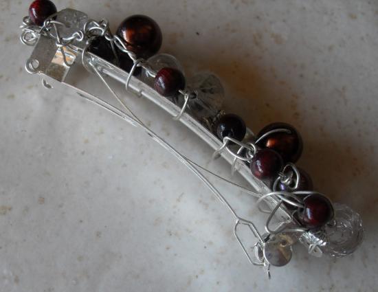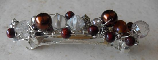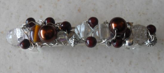 Barrette métal, perles marrons et blanches.