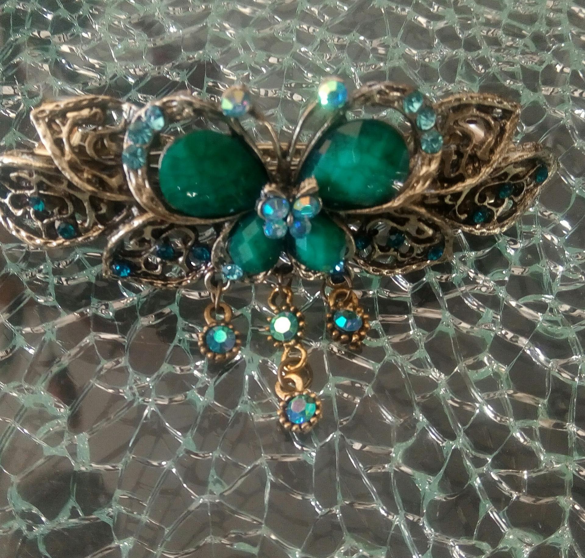 Barrette métal, verte, strass et cabochon.