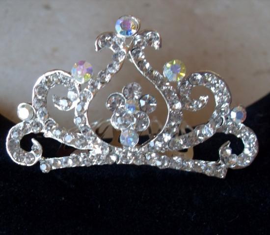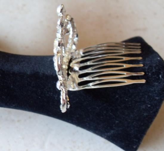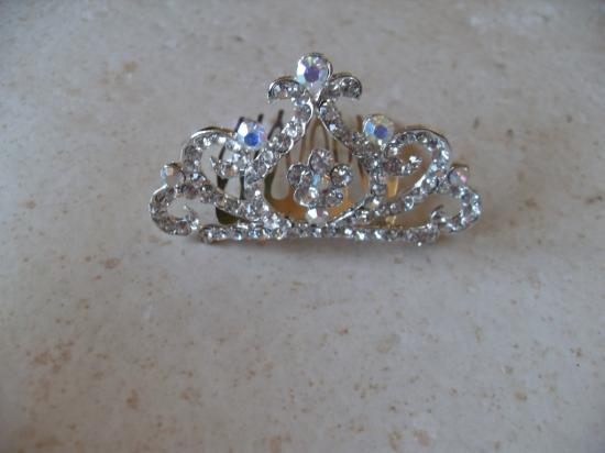 Diadème en métal argenté et strass blanc. Se positionne grâce à son peigne.