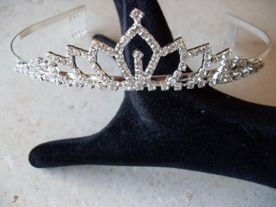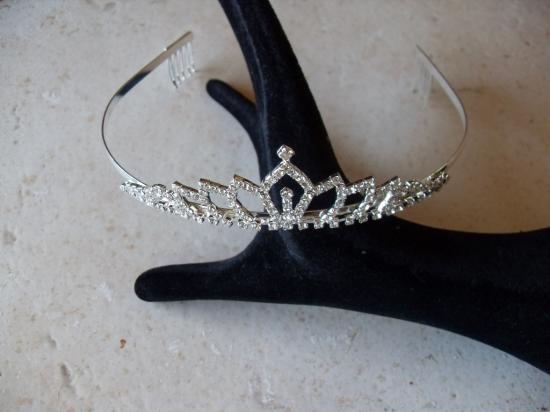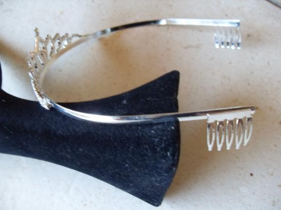 Diadème en métal argenté et strass blanc. Se positionne grâce à son serre-tête.