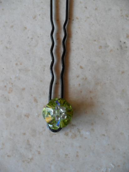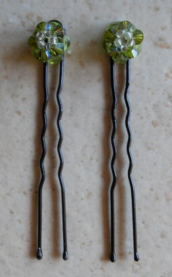 Epingles cheveux en métal noir et fleurs vert olivine en cristal de swarovski.