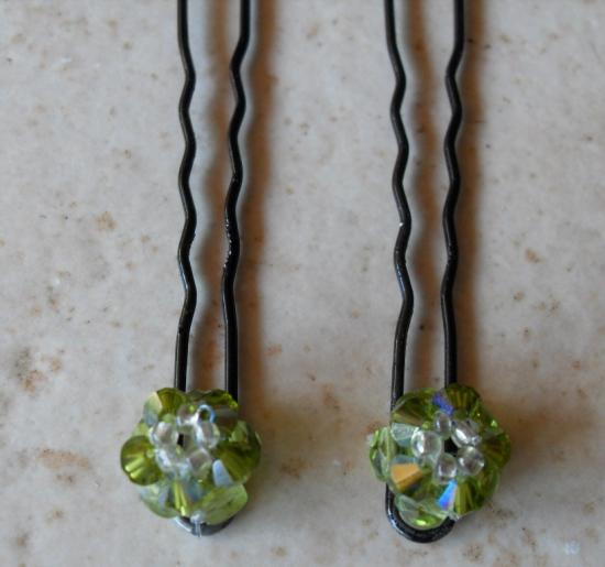 Epingles cheveux fleurs olivine cristal de swarovski. Création artisanale unique.