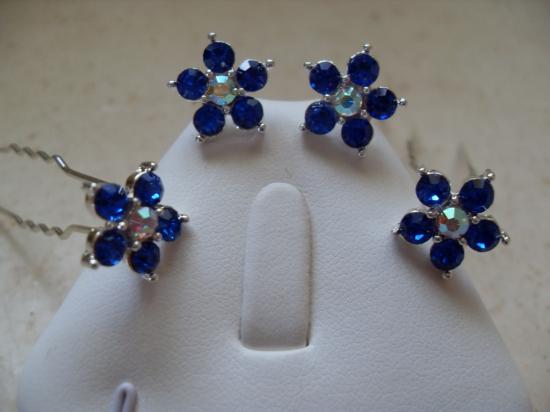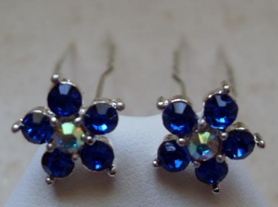 Epingles cheveux fleurs strass bleu.