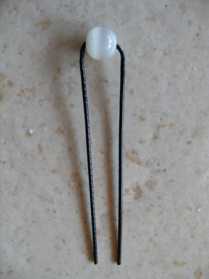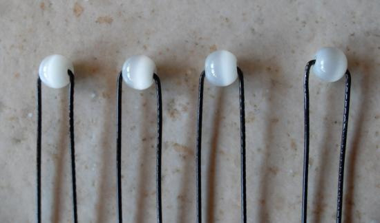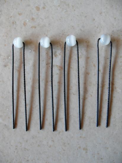 Epingles cheveux en métal noir et perles blanches oeil de chat.