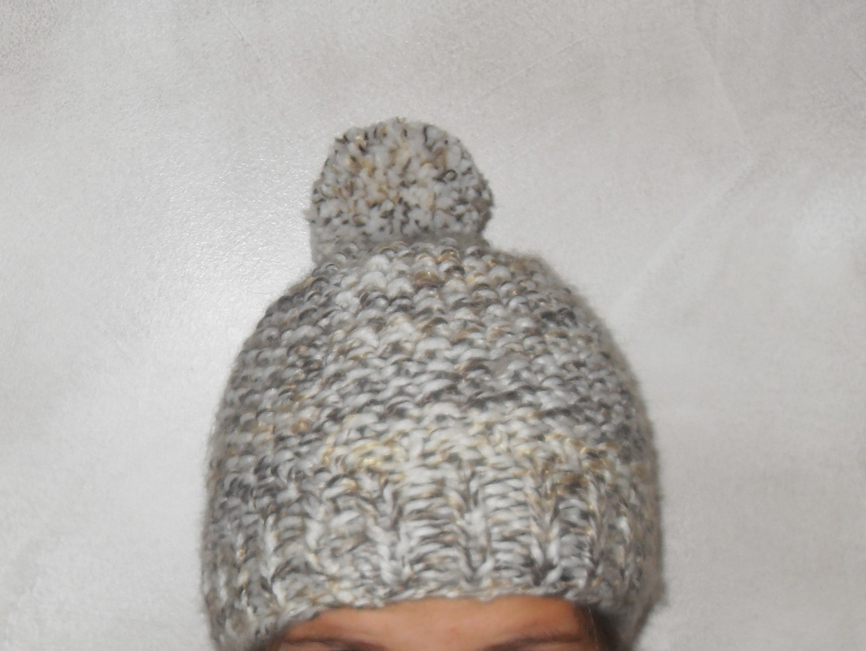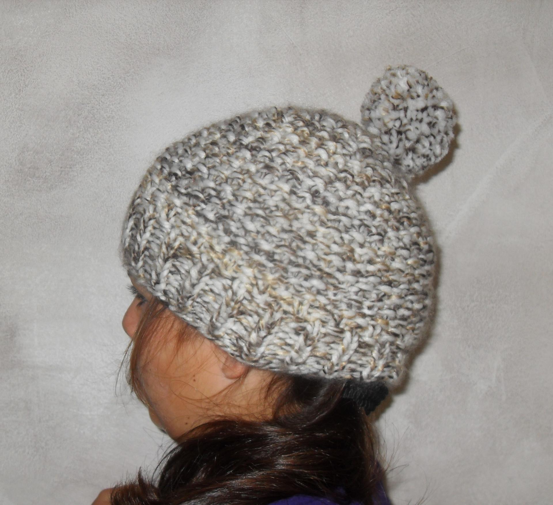 Bonnet beige-marron et pompon, création artisanale made in France.