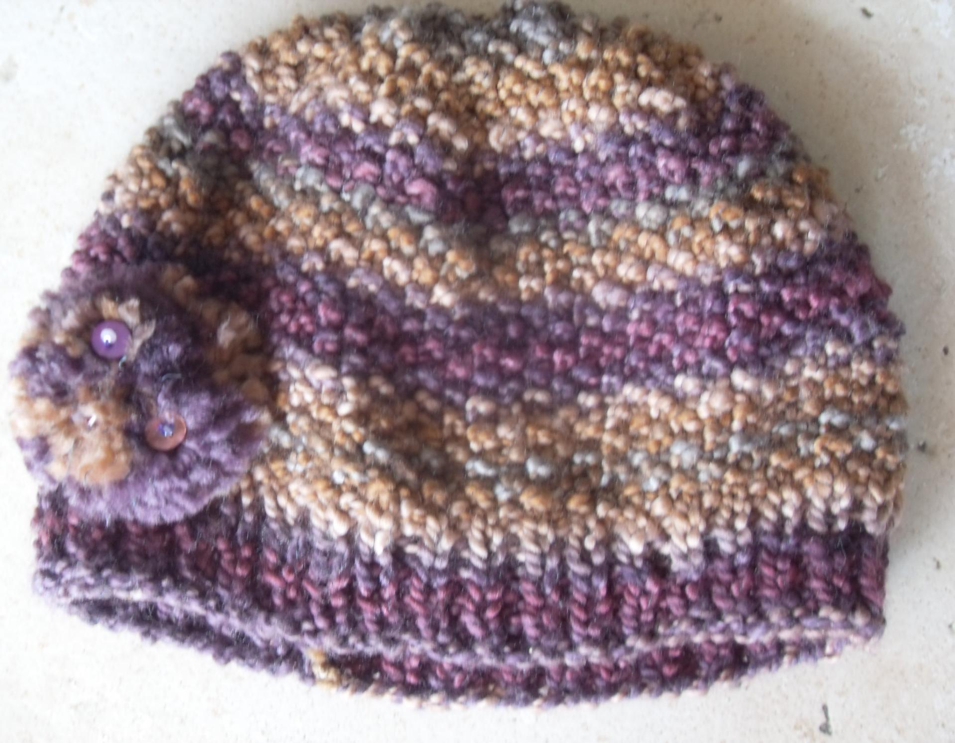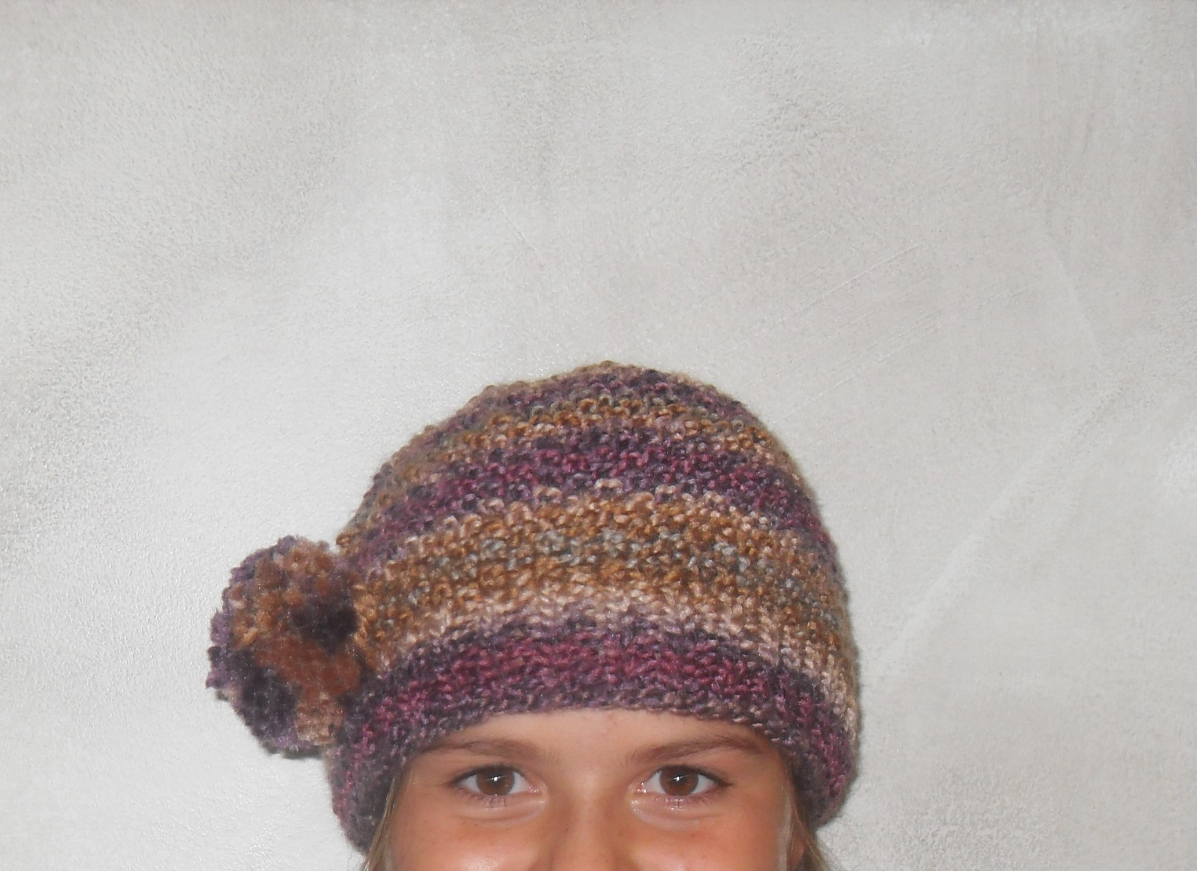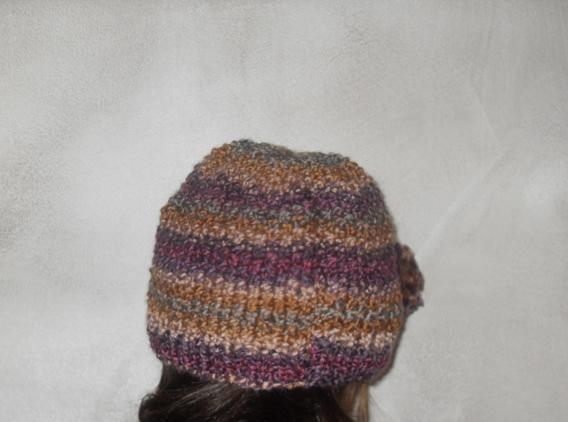 Bonnet laine multicolore prune, mauve, beige et pompon-cristal de swarovski.