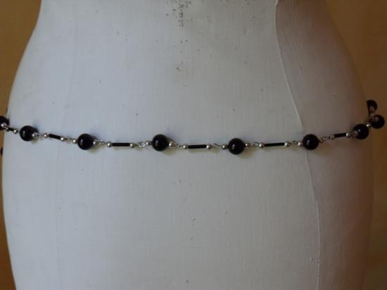 Ceinture-bijou perles noires rondes et tubes et perles argentées. 2 rangs sur le devant. Fermoir argenté. Taille unique car réglable.