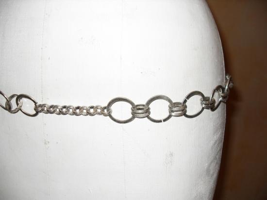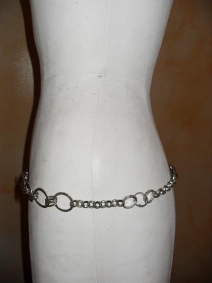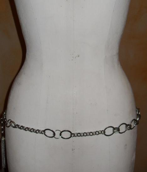 Ceinture en métal argenté avec ses maillons, cercles et pompon. Fermoir mousqueton.