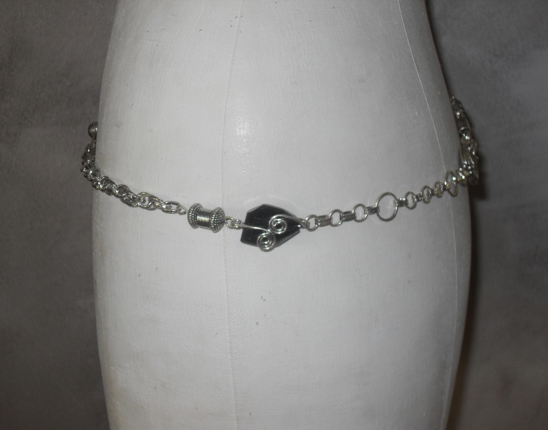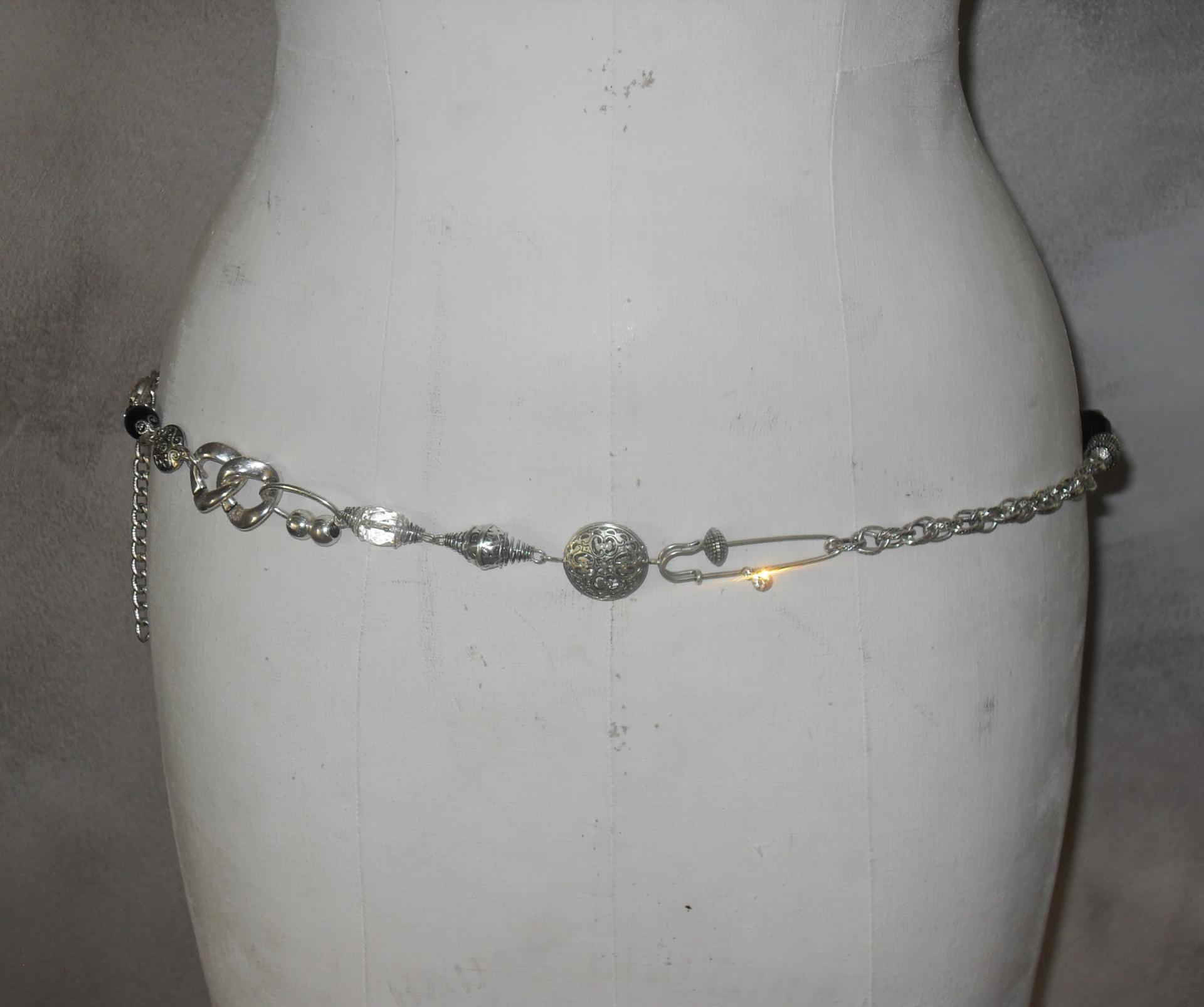 Ceinture-bijou, chaîne-maillons, grosse perle noire, épingles et strass, création artisanale.