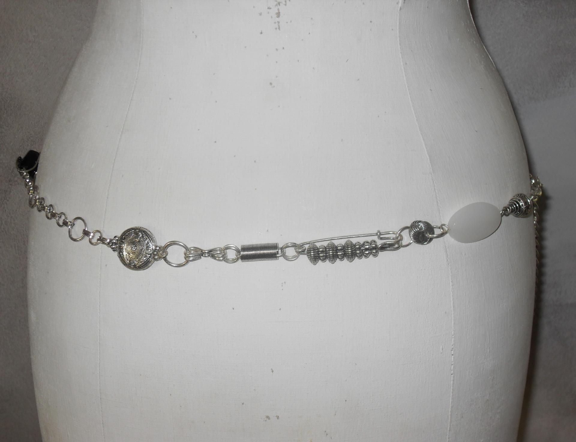 Ceinture-bijou, chaîne-maillons, grosse perle noire, épingles et strass.