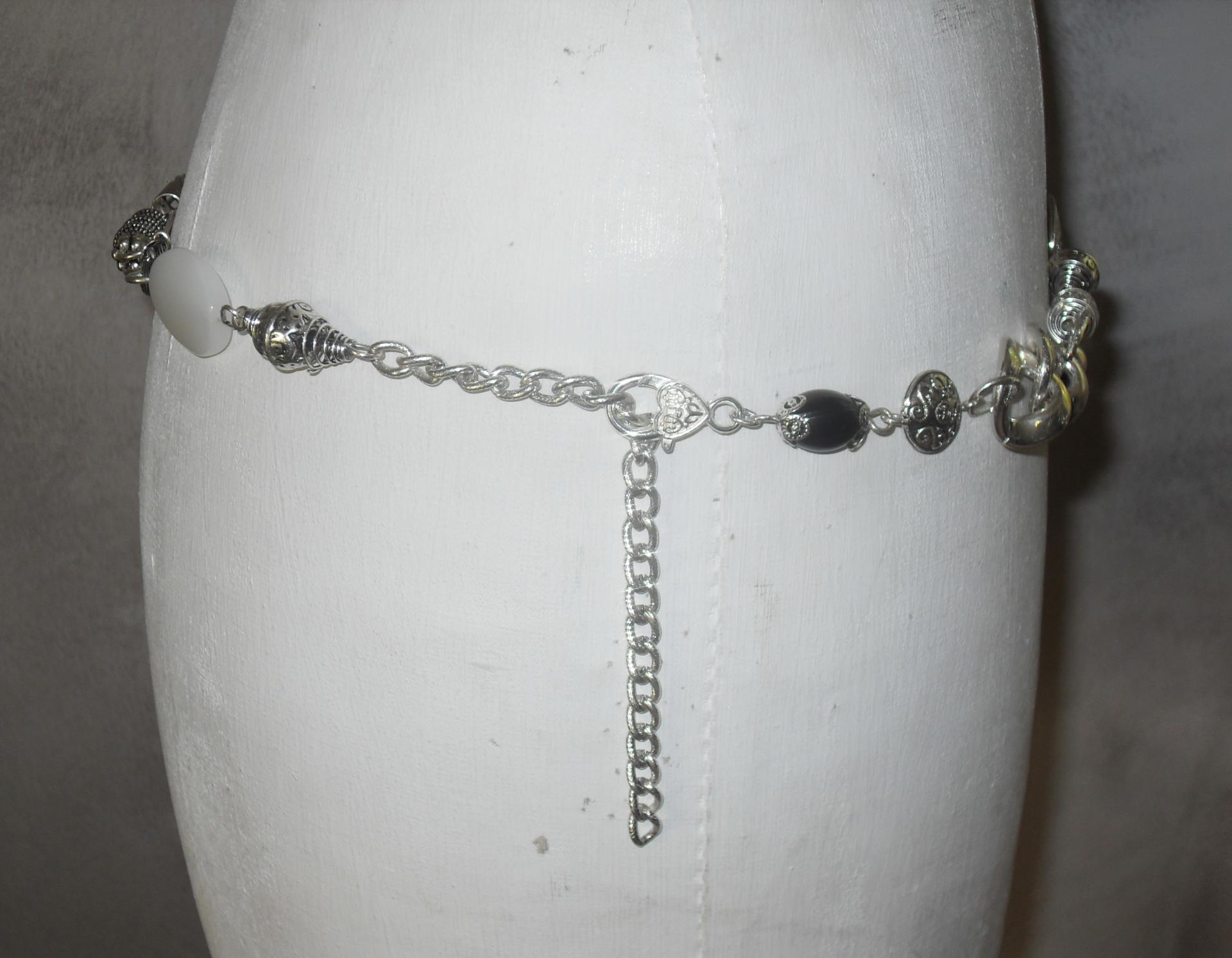Ceinture-bijou avec chaîne et maillons en métal argenté, grosse perle noire, perle blanche, épingles et strass. Fermoir mousqueton argenté.