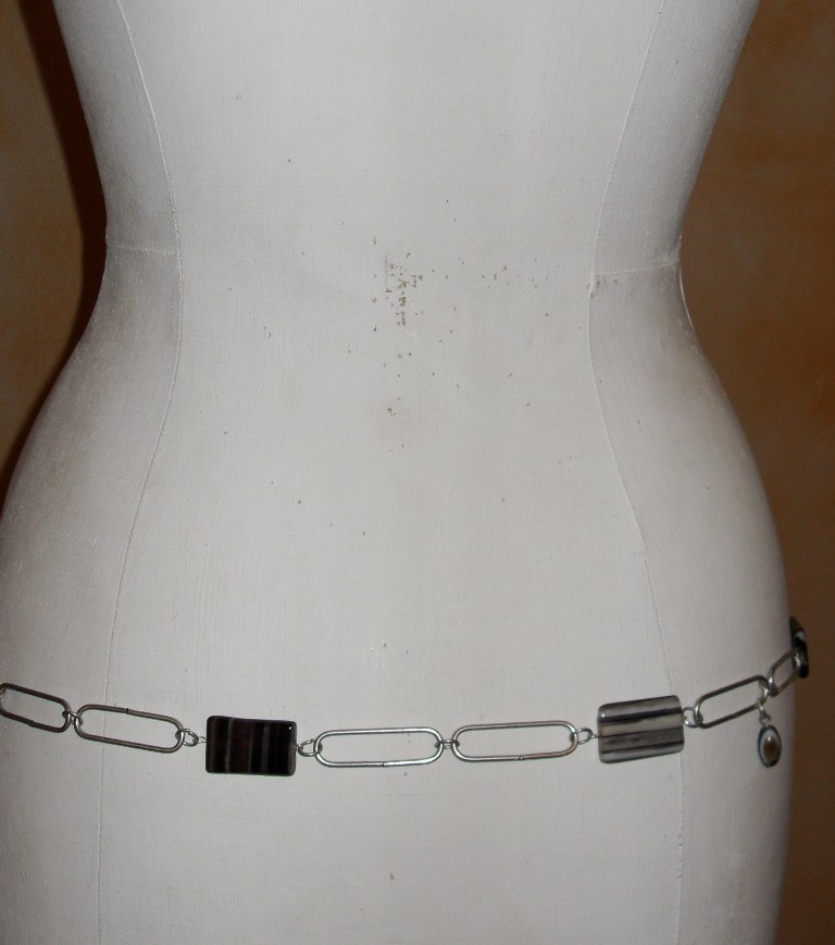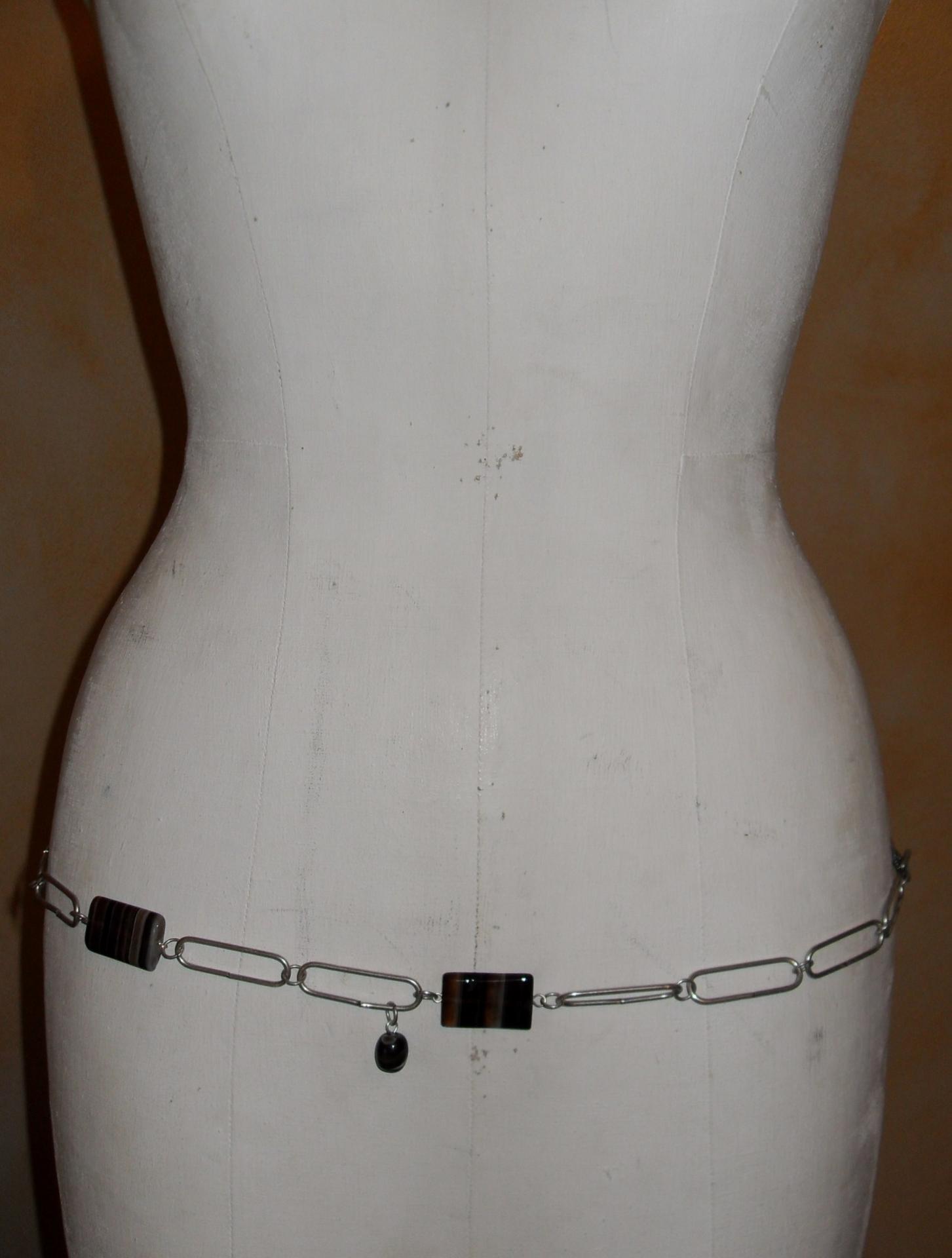 Ceinture-bijou avec maillons en métal argenté, perles rectangles marron, gris et noir et deux perles pendantes. Fermoir T argenté.