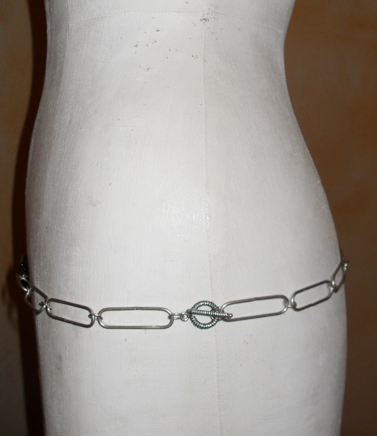 Ceinture-bijou, chaîne-maillons rectangle, pierres et pampilles, création artisanale.