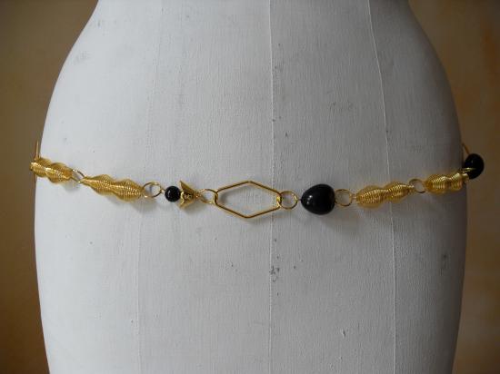 Ceinture-bijou en métal doré, chaîne dorée et perles noires. Taille unique, longueur réglable grâce à à sa chaînette et son fermoir.
