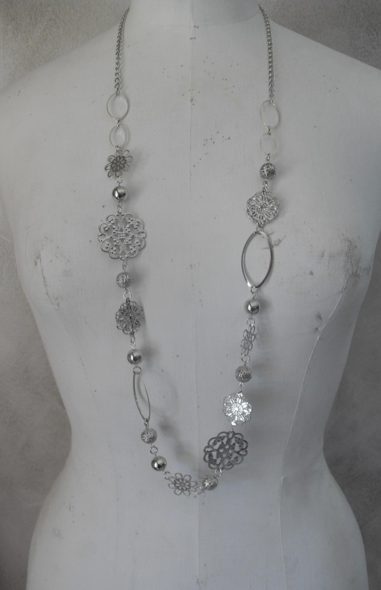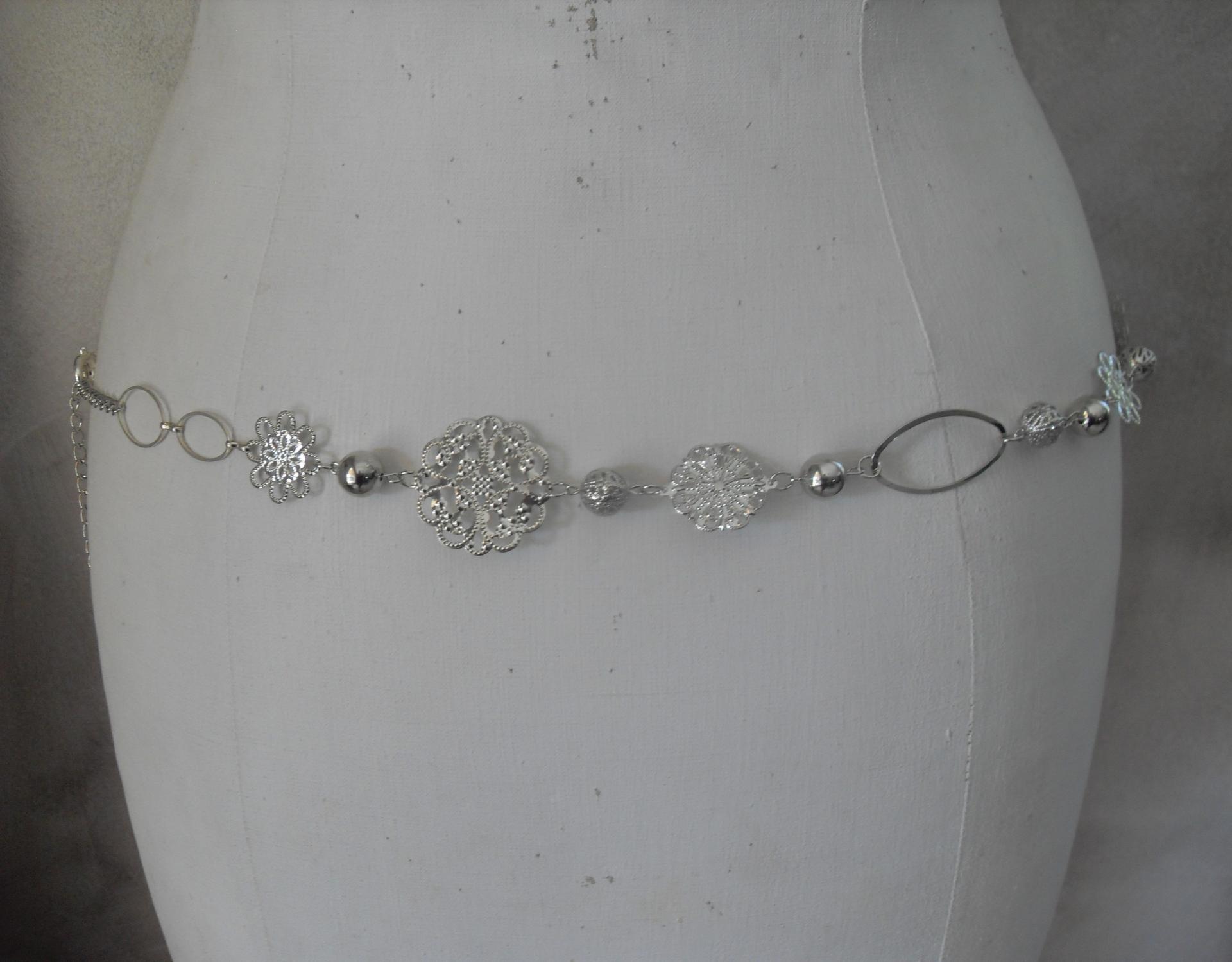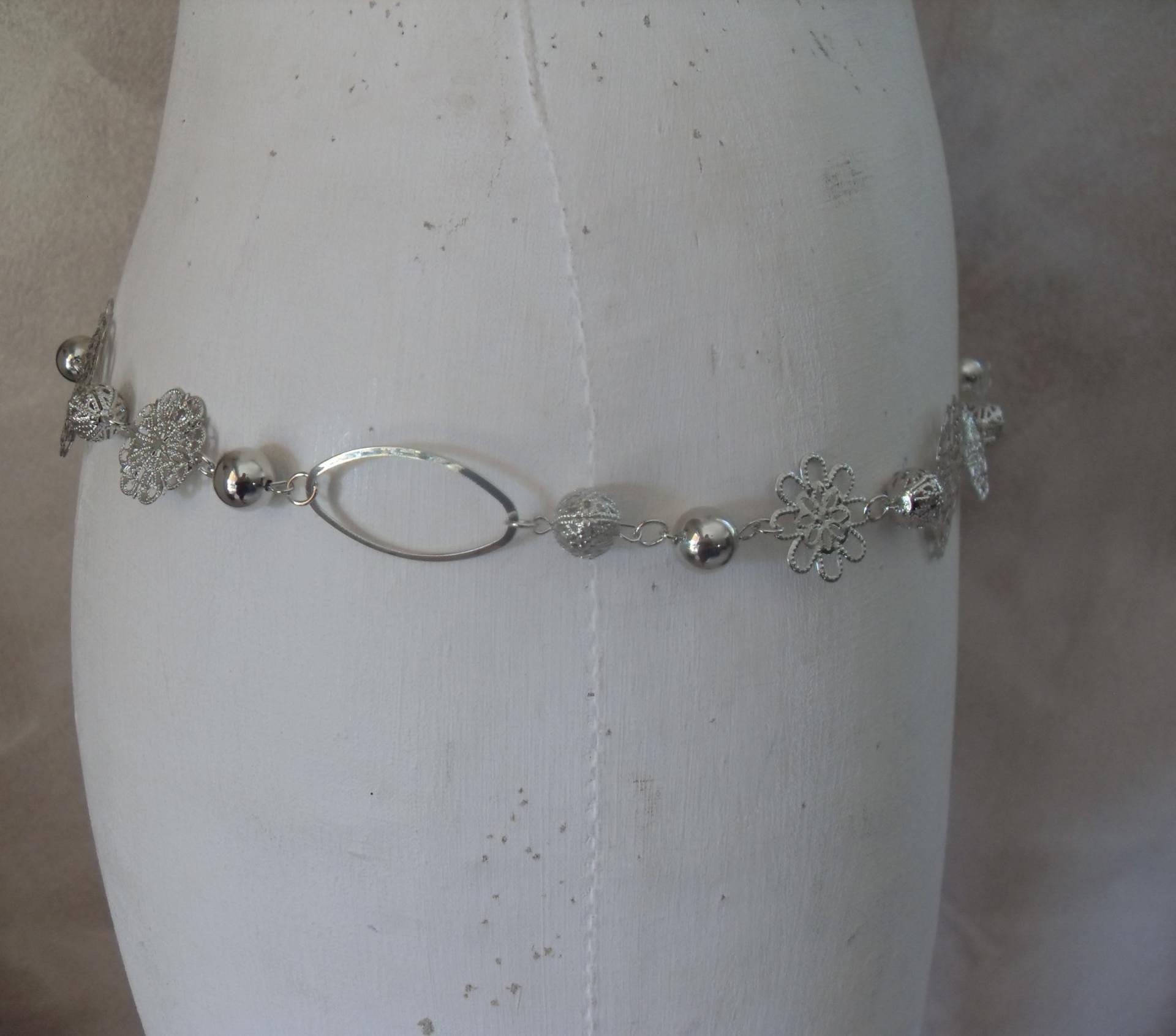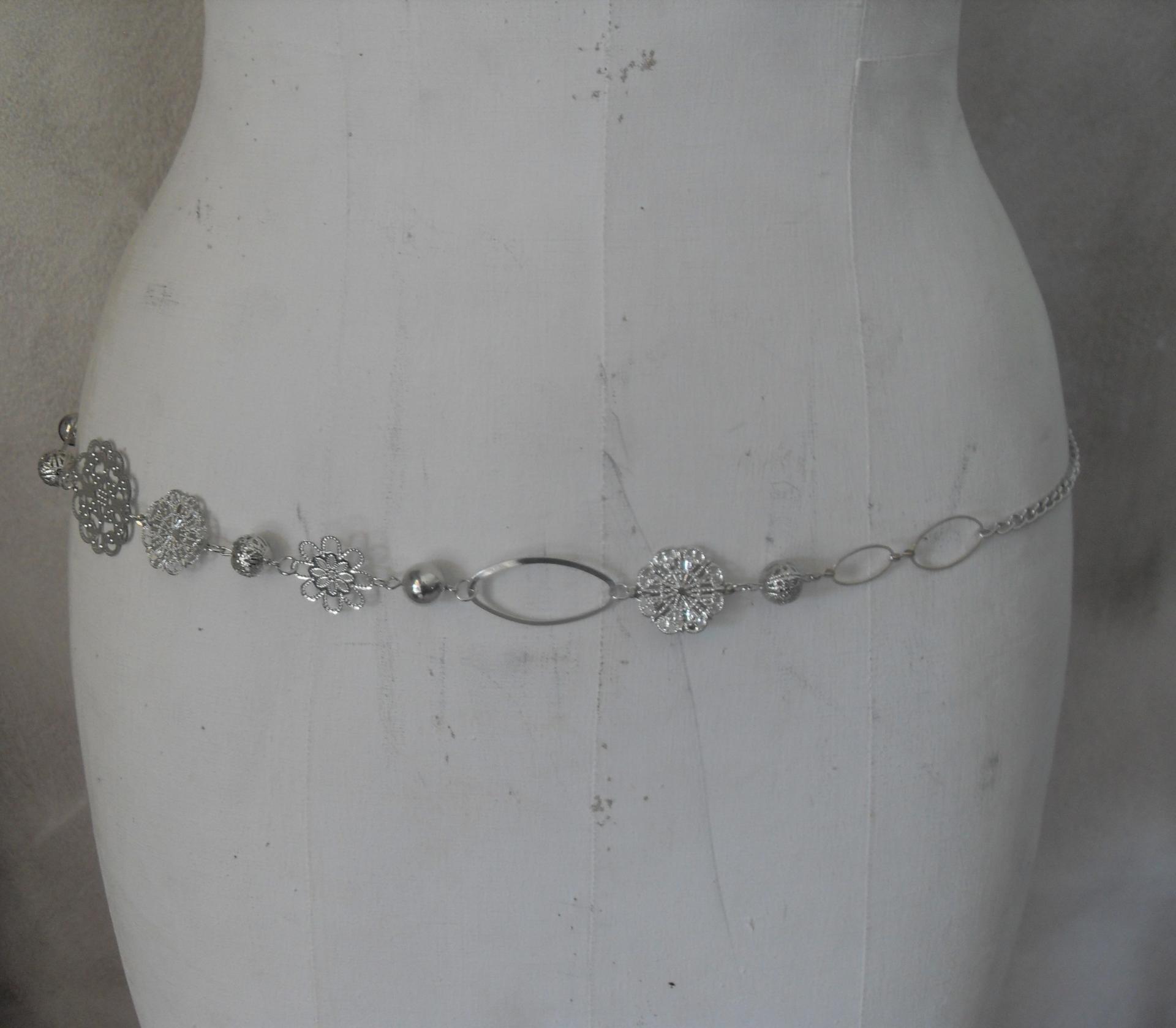 Ceinture en métal argenté avec ses fleurs, perles, chaîne et maillons ovales. Fermoir mousqueton.
