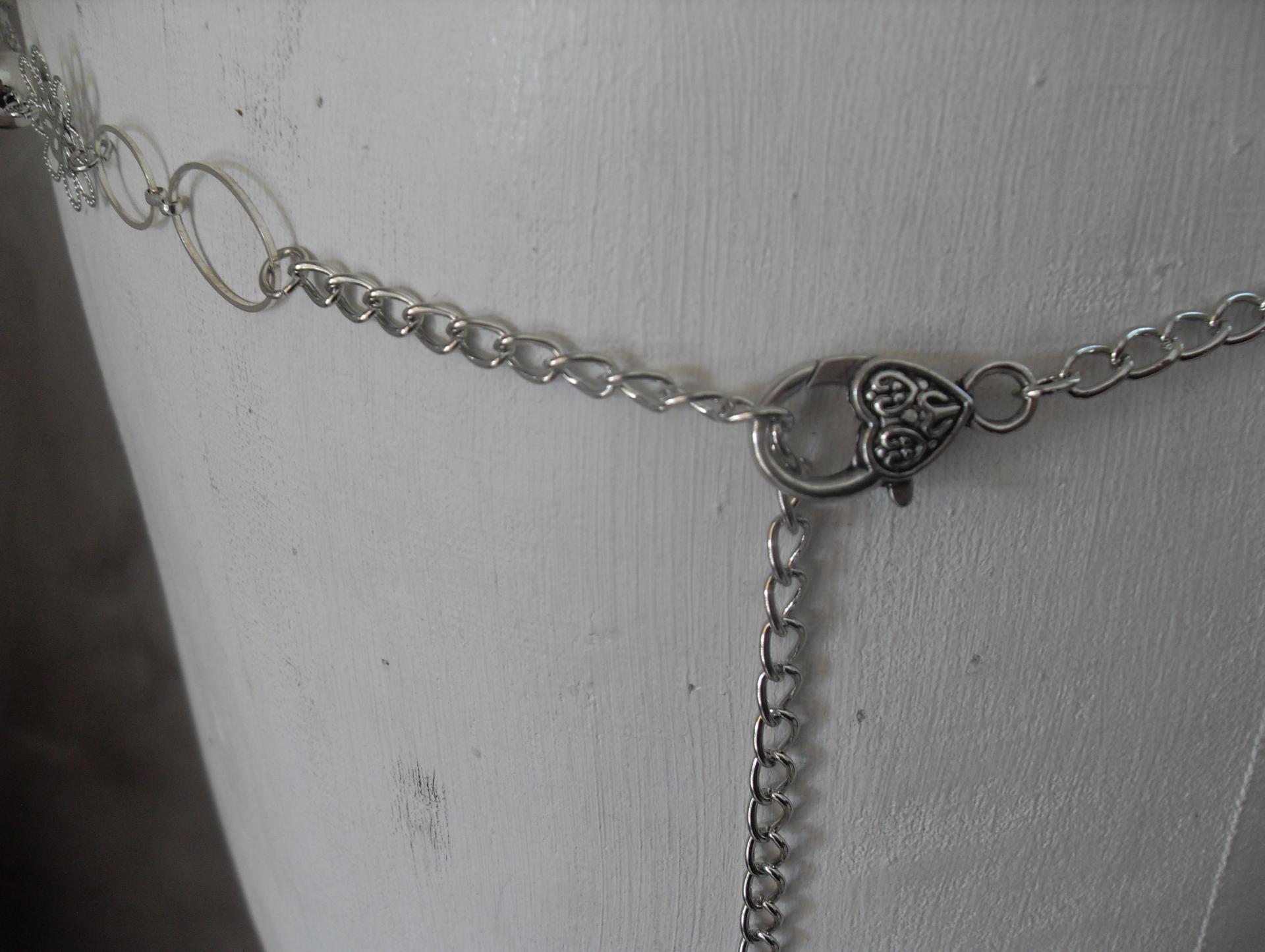 Ceinture-bijou, fleurs, perles et chaîne et maillons ovales.