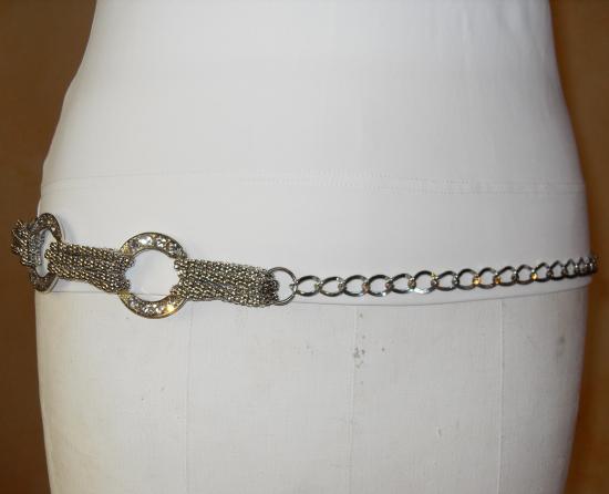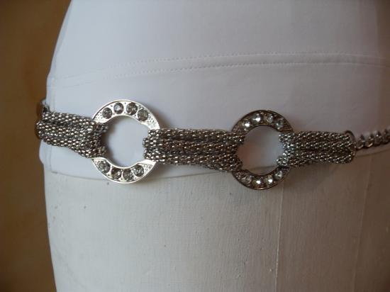 Ceinture en métal argenté avec deux cercles ornés de strass.