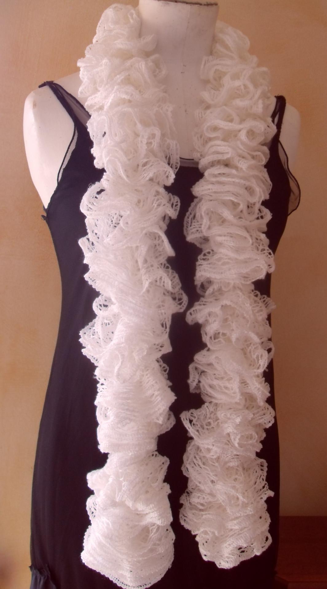 Echarpe blanche avec un fil argent, en laine ruban à volant, tricotée main.
