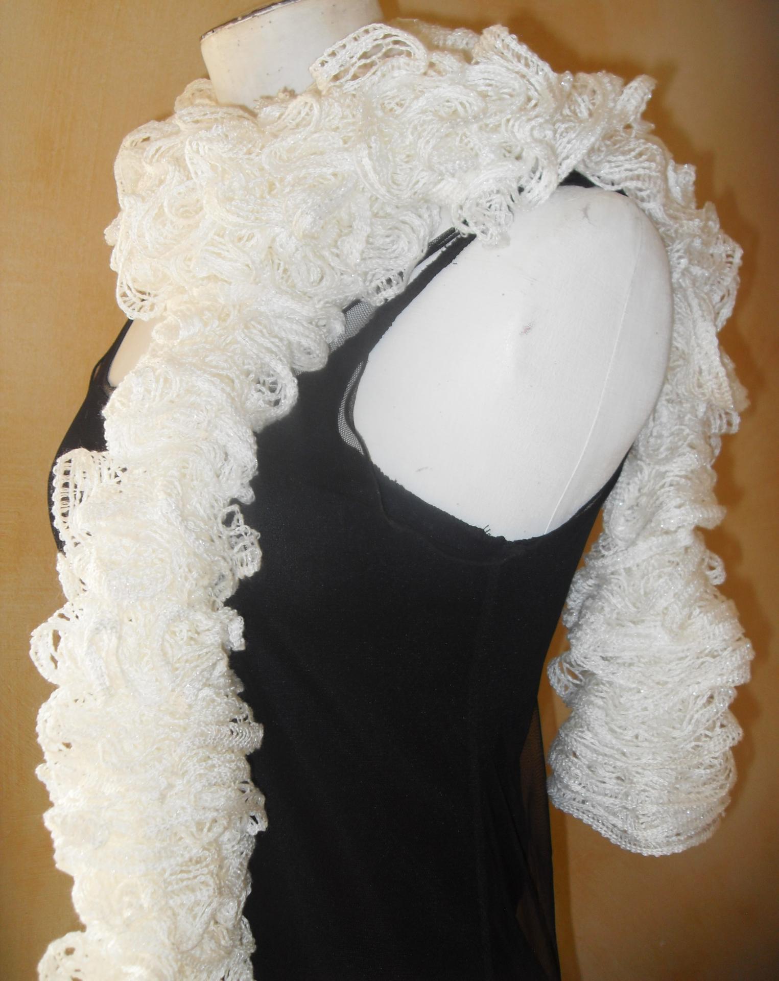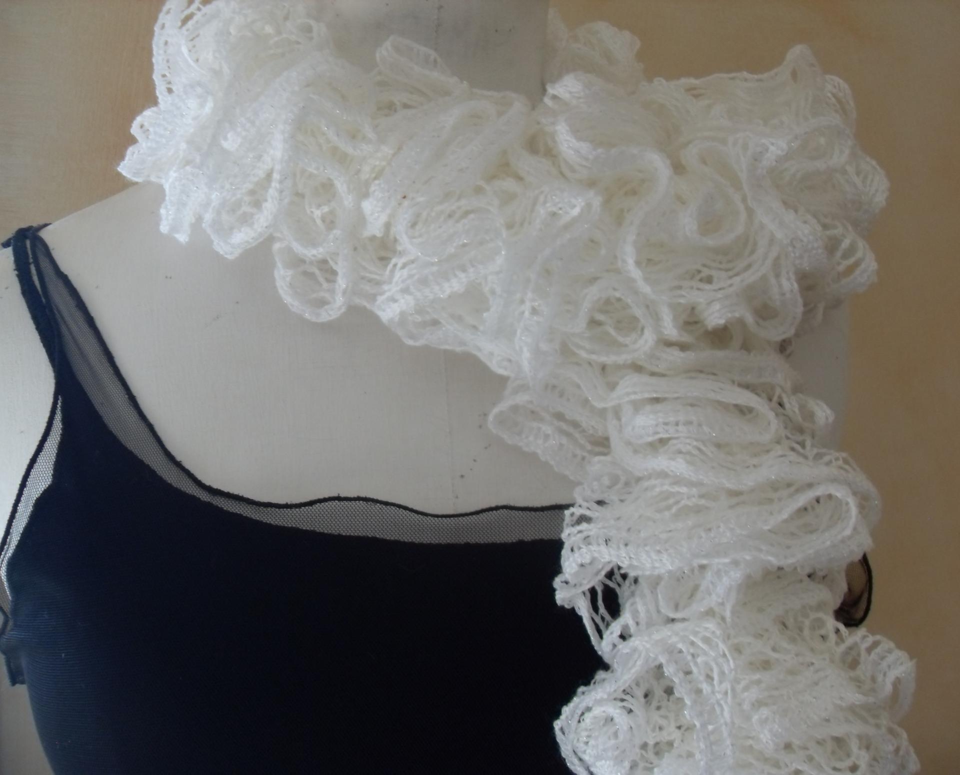 Maxi écharpe frou-frou blanche et fil argent à volant, laine ruban.