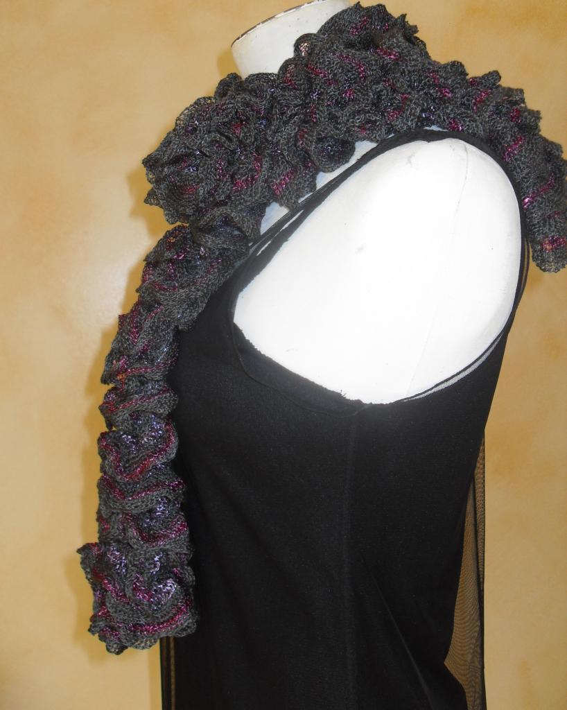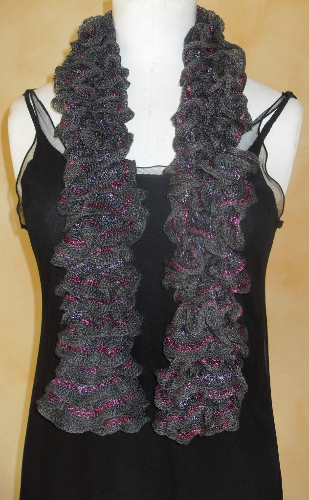 Echarpe frou-frou grise-fushia et mauve à volant, laine ruban.