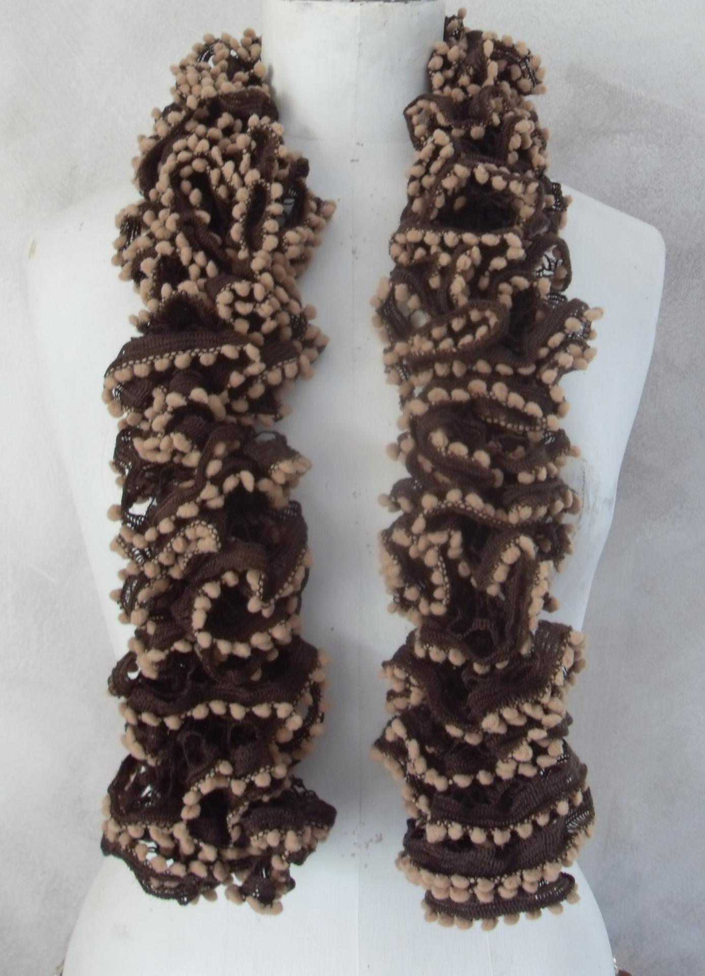 Echarpe marron en laine ruban à volant et pompons clairs, tricotée main.