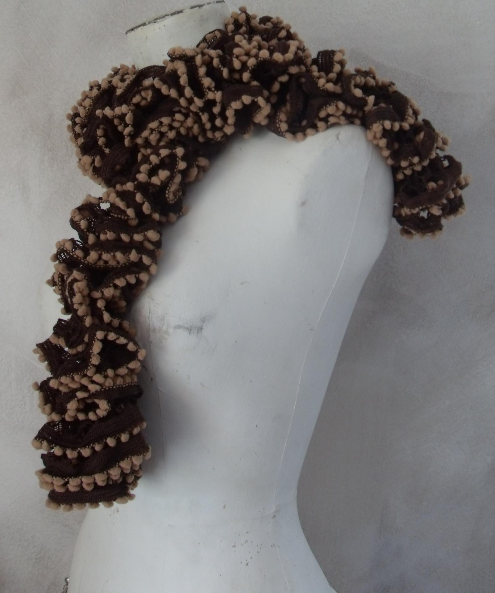Echarpe frou-frou marron à volant et pompons clairs, laine ruban.