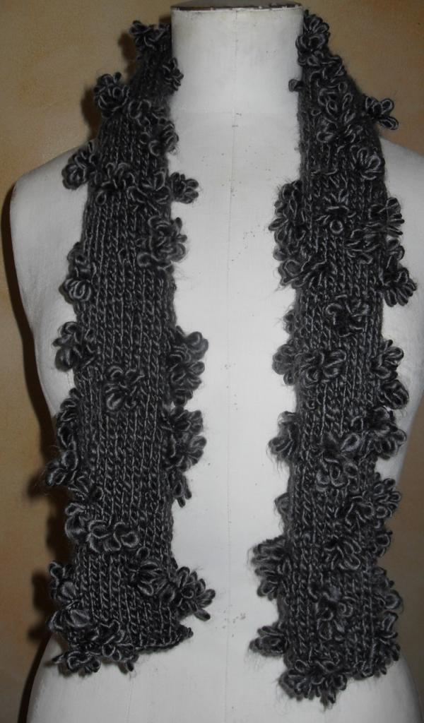 Echarpe grise, laine et fleurs.