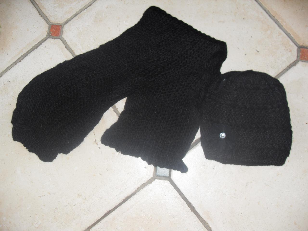 Echarpe laine noire et son bonnet fleur et strass.