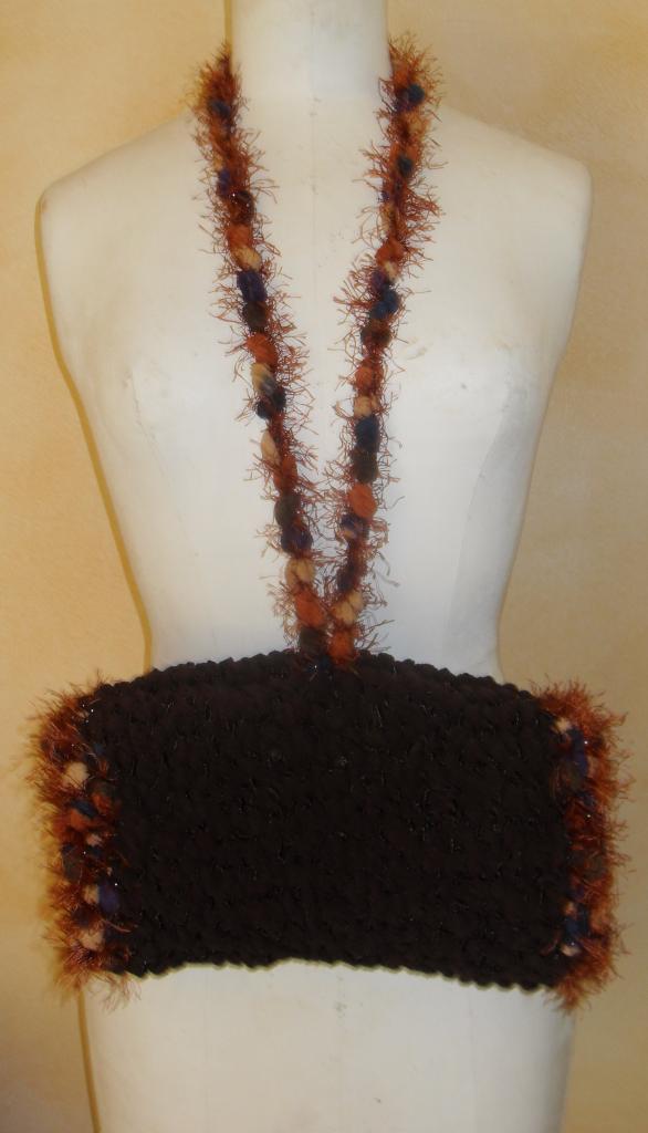 Manchon en laine imitation fausse fourrure et boules, marron et couleurs diverses sur les côtés et partie centrale en laine effet petites boules marron.