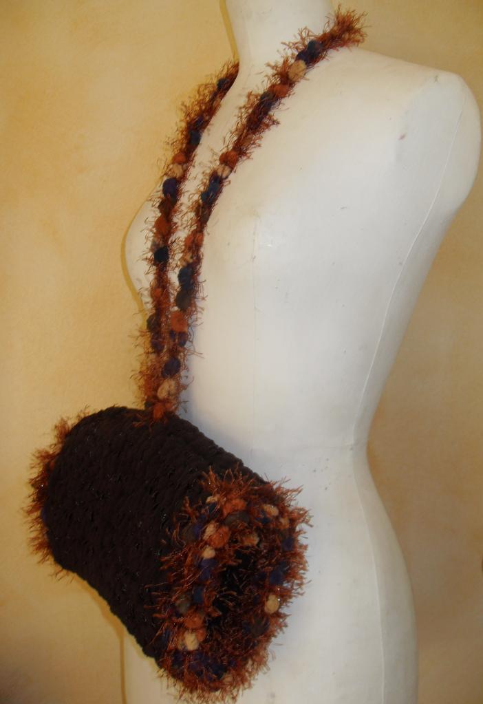 Manchon marron, fausse fourrure et laine boules, création artisanale unique.
