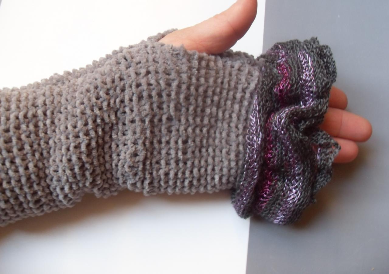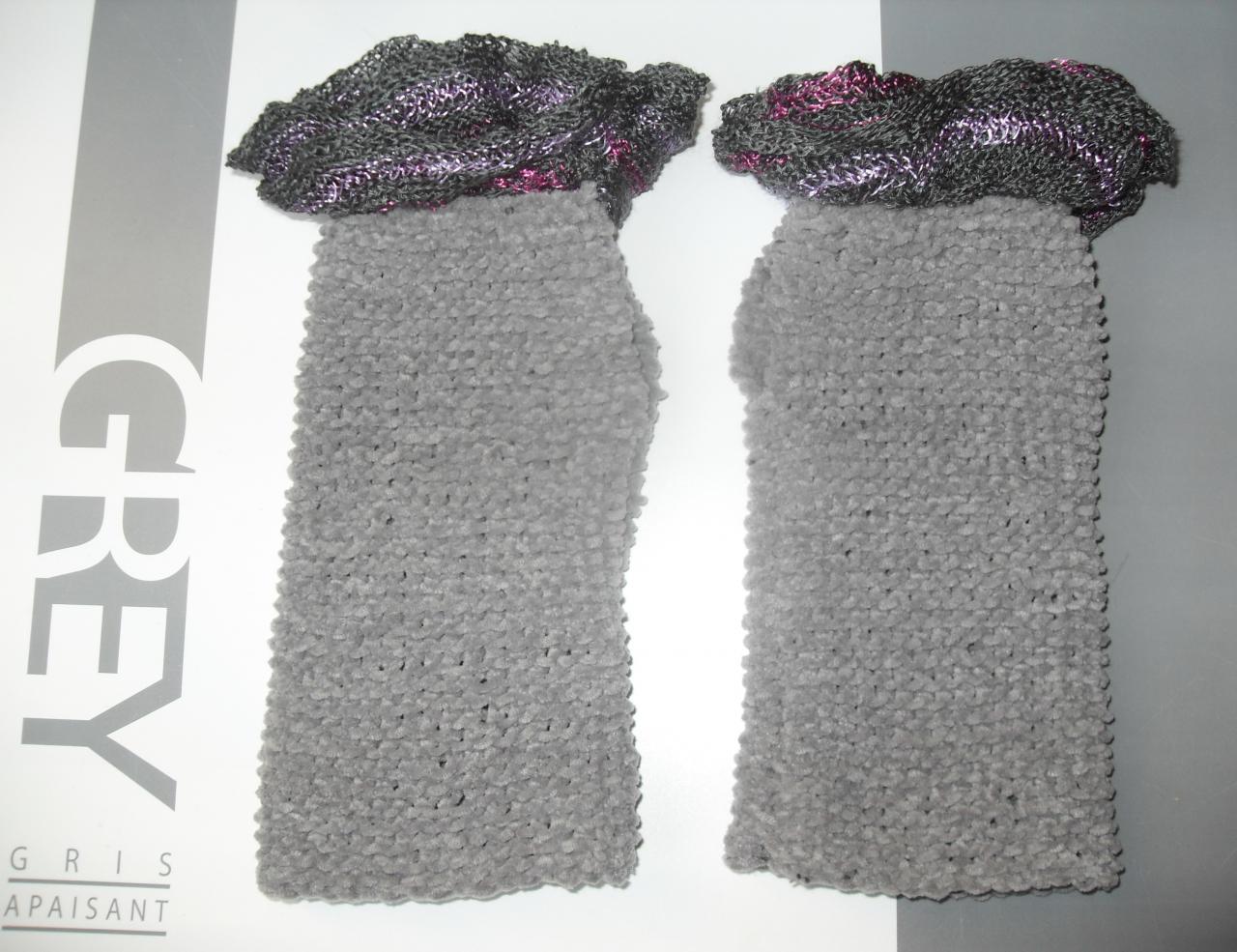 Mitaines grises, laine et frou-frou gris-fuschia et mauve, à volants.