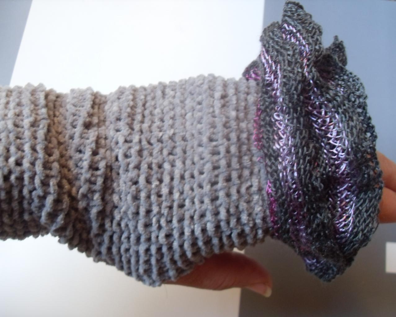 Mitaines grises, laine fine et laine frou-frou à volants gris-fuschia et mauve.