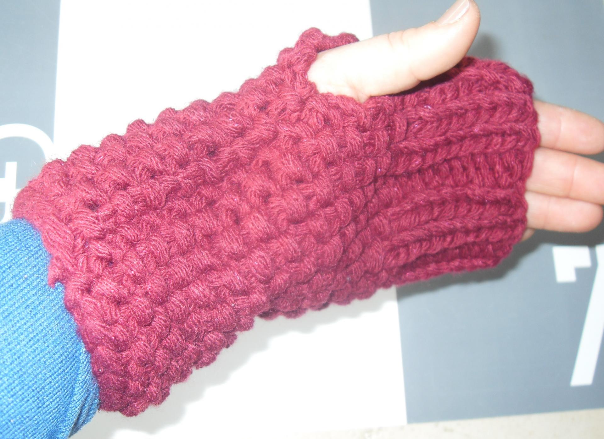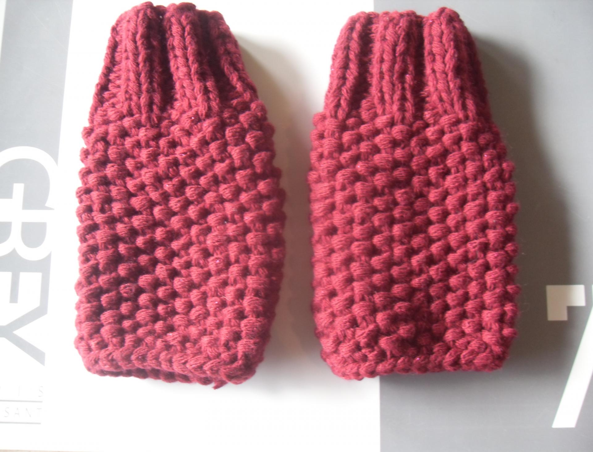 Mitaines laine bordeaux et fil argenté.