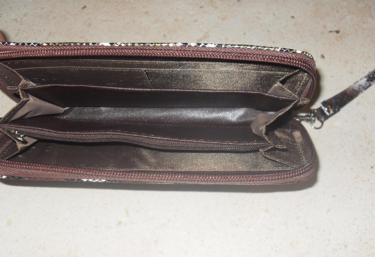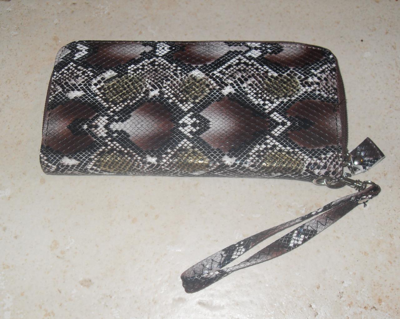 Porte-feuille ou pochette à main marron, imitation peau de serpent.