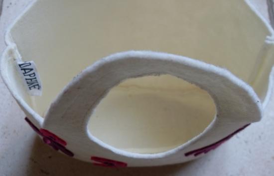 Sac blanc en feutrine décoré de petites fleurs roses et violet et libellule avec strass.