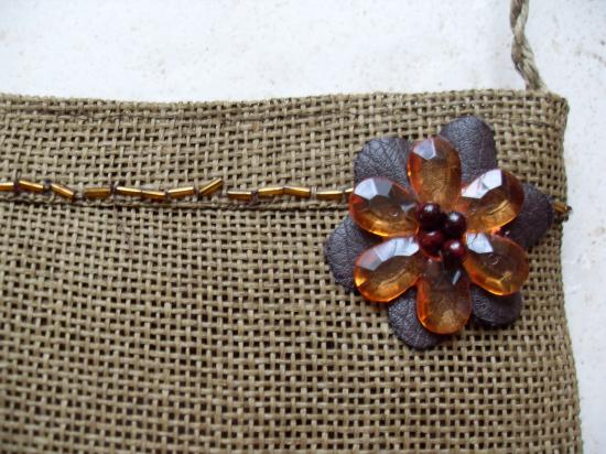 Sac à main décoré par une fleur en cuir marron et orange et brodé de perles de rocailles. Sac doublé. Fermeture éclair.