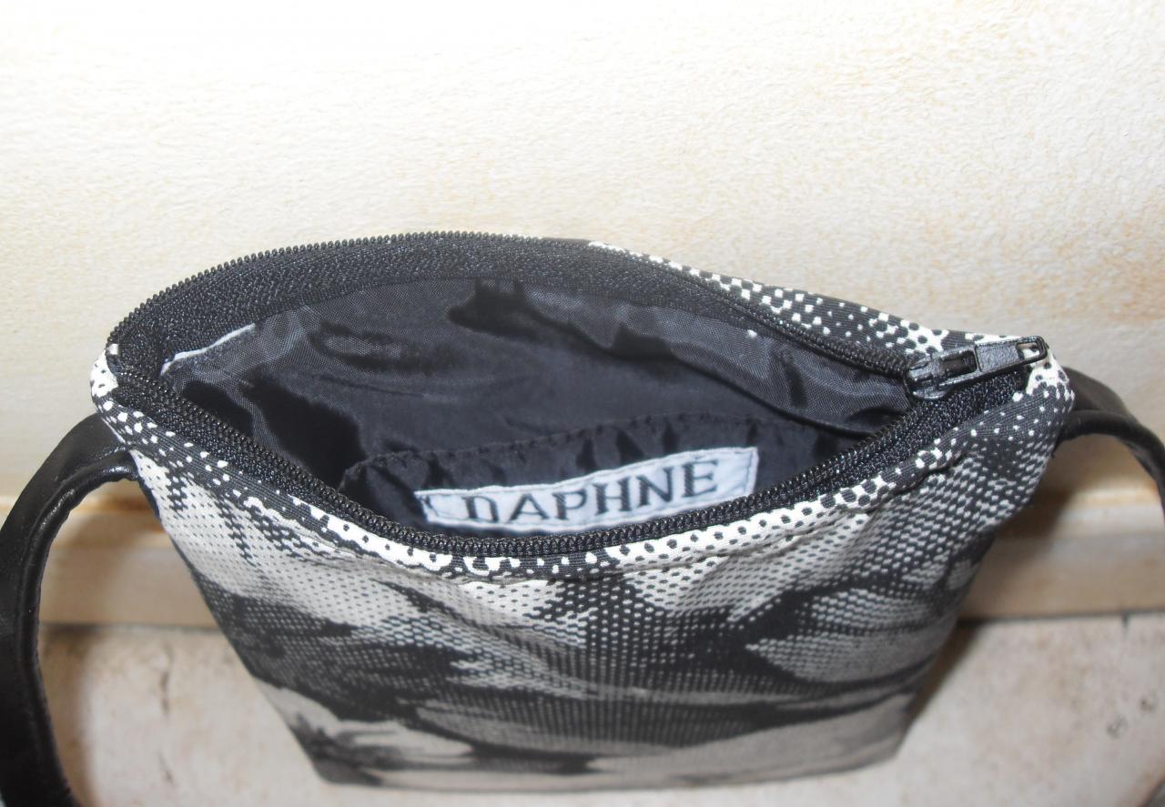 Sac à main bandoulière en tissu fleuri noir et blanc.