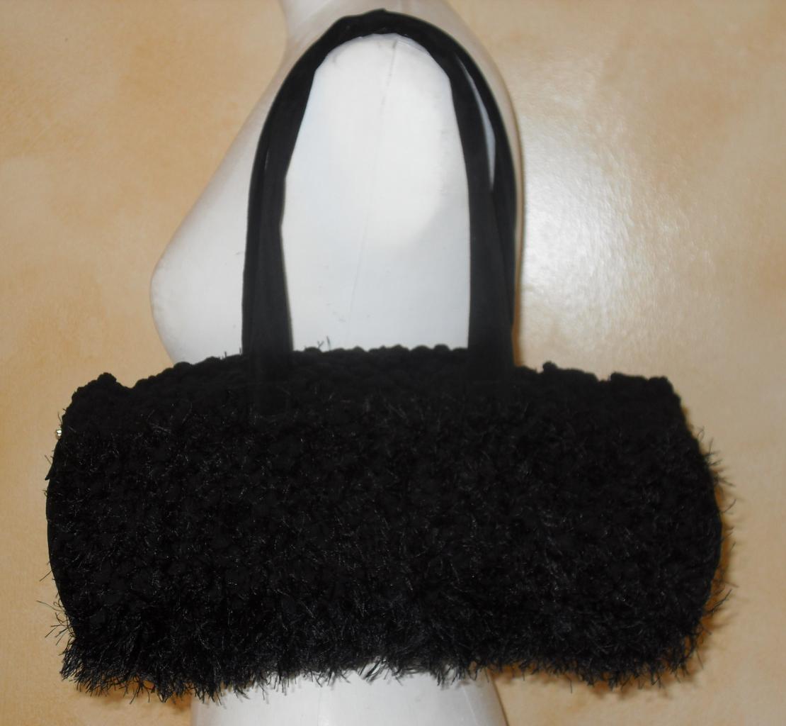 Sac à main forme bowling en laine noire imitation fausse fourrure et laine boules.Côtés en daim. Crital de swarovski sur les côtés.