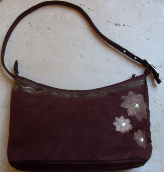 Sac en suédine marron avec motifs et fleurs peints à la main et strass.
