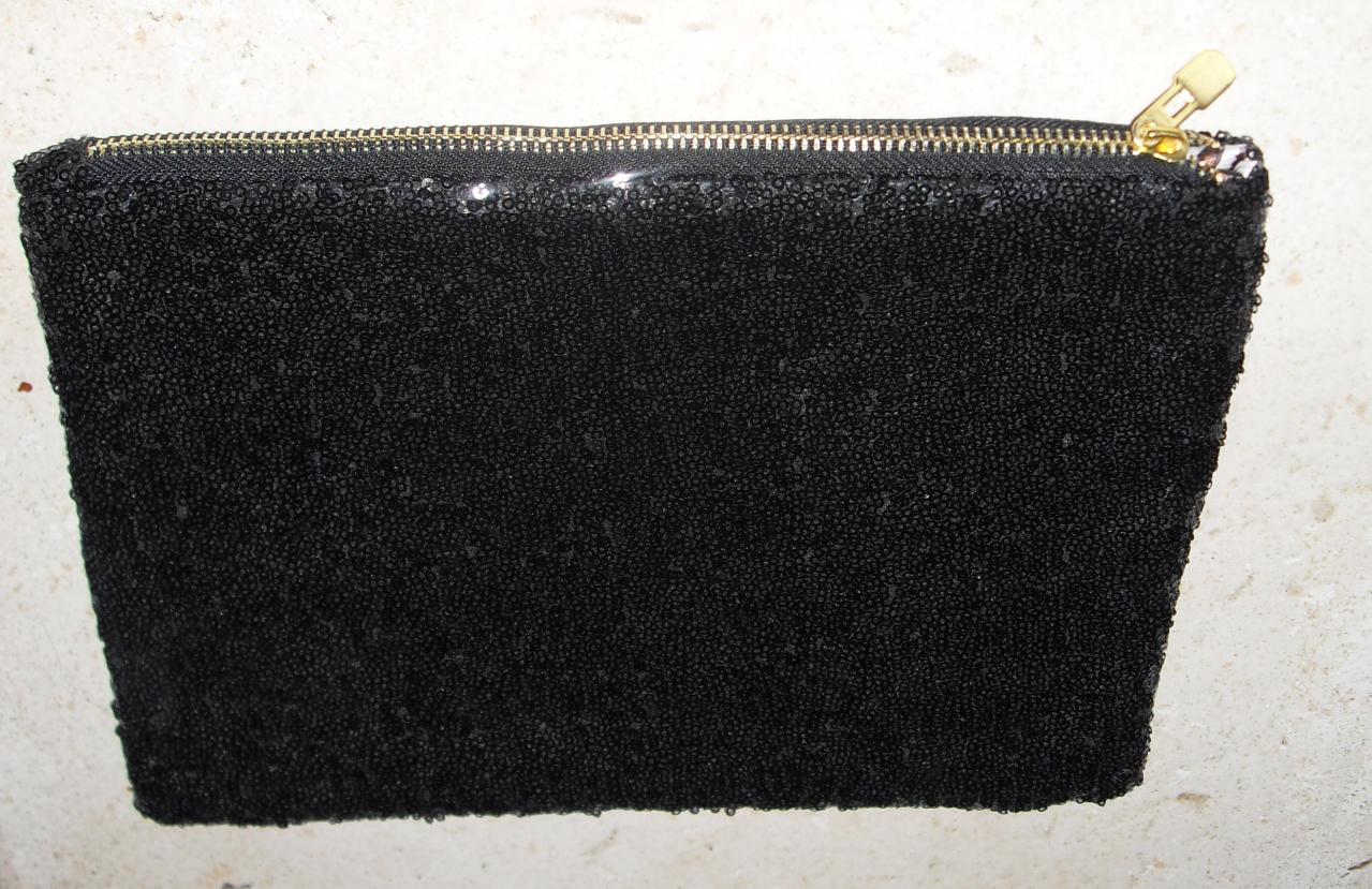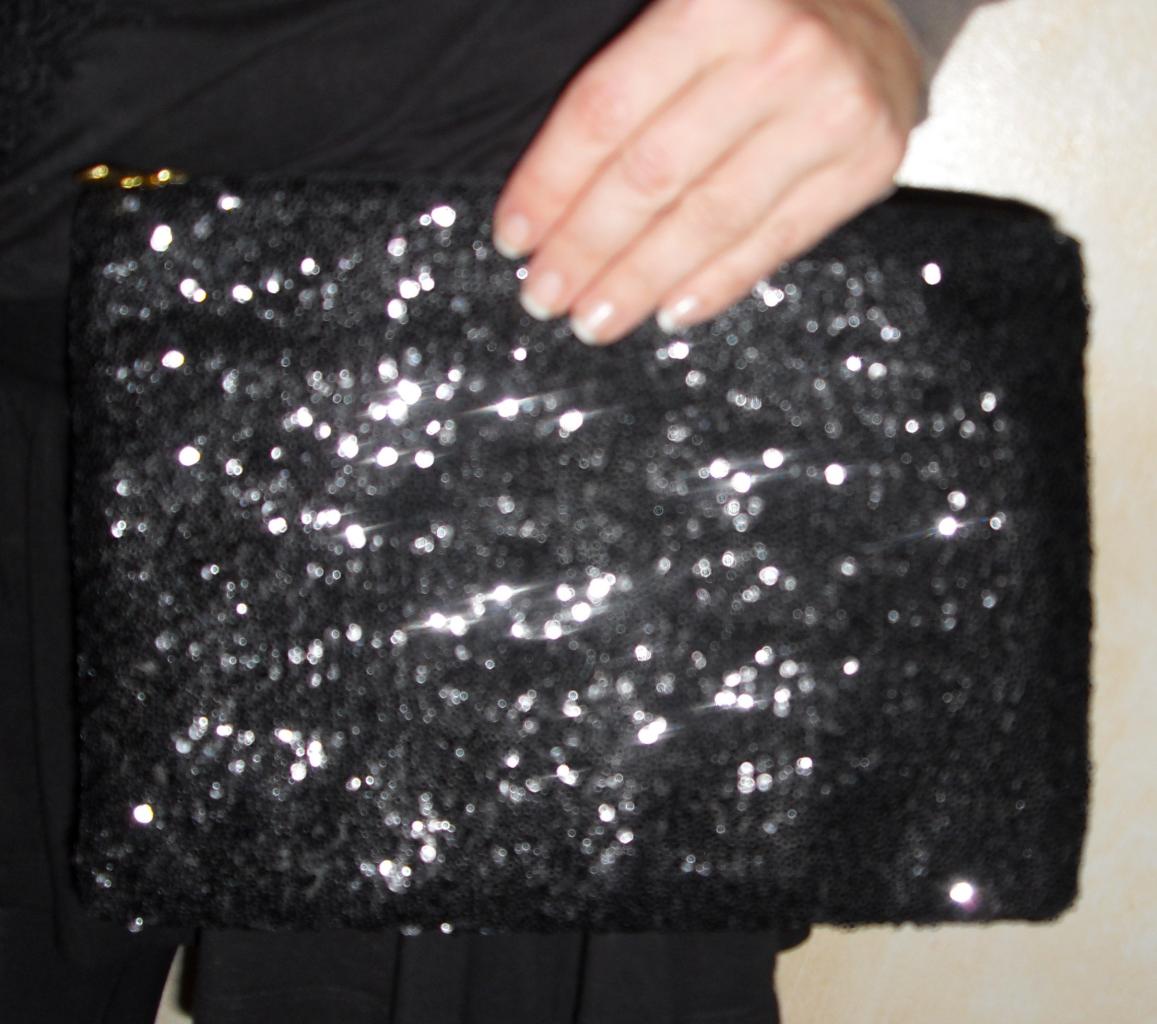 Sac à main pochette noire et paillettes.
