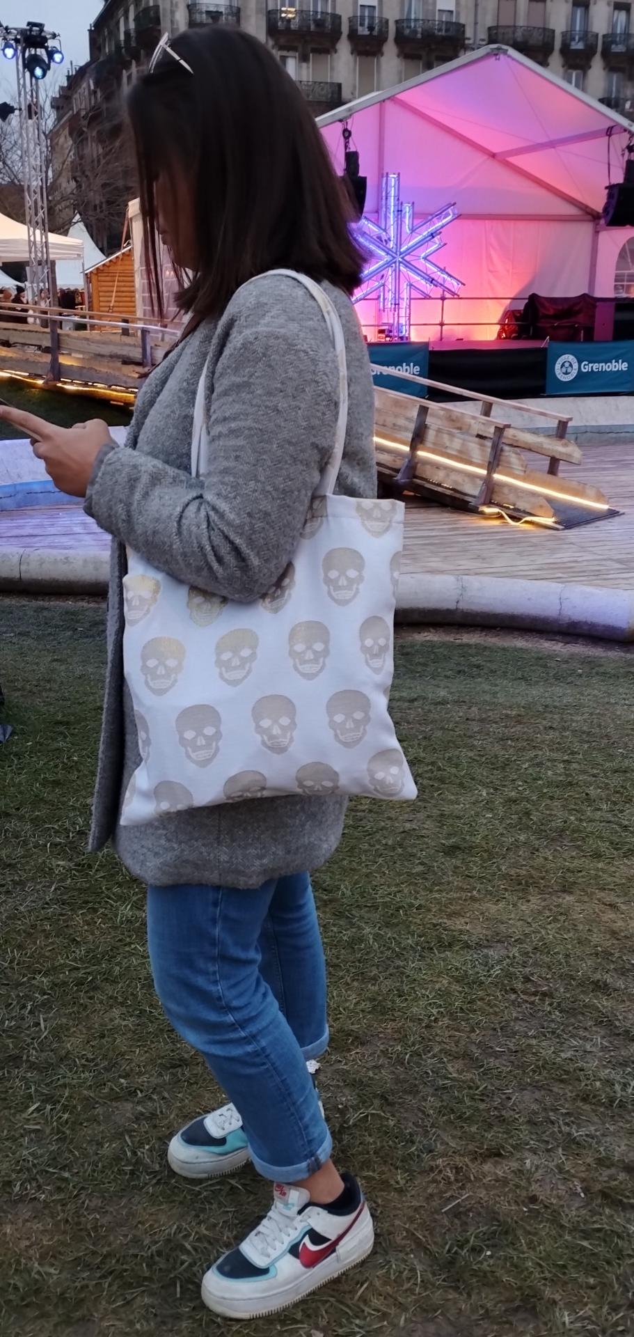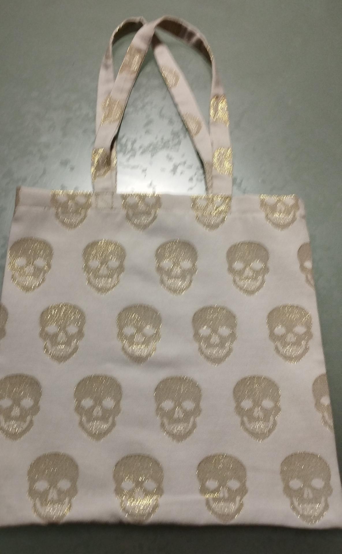 Tote bag têtes de mort dorées.