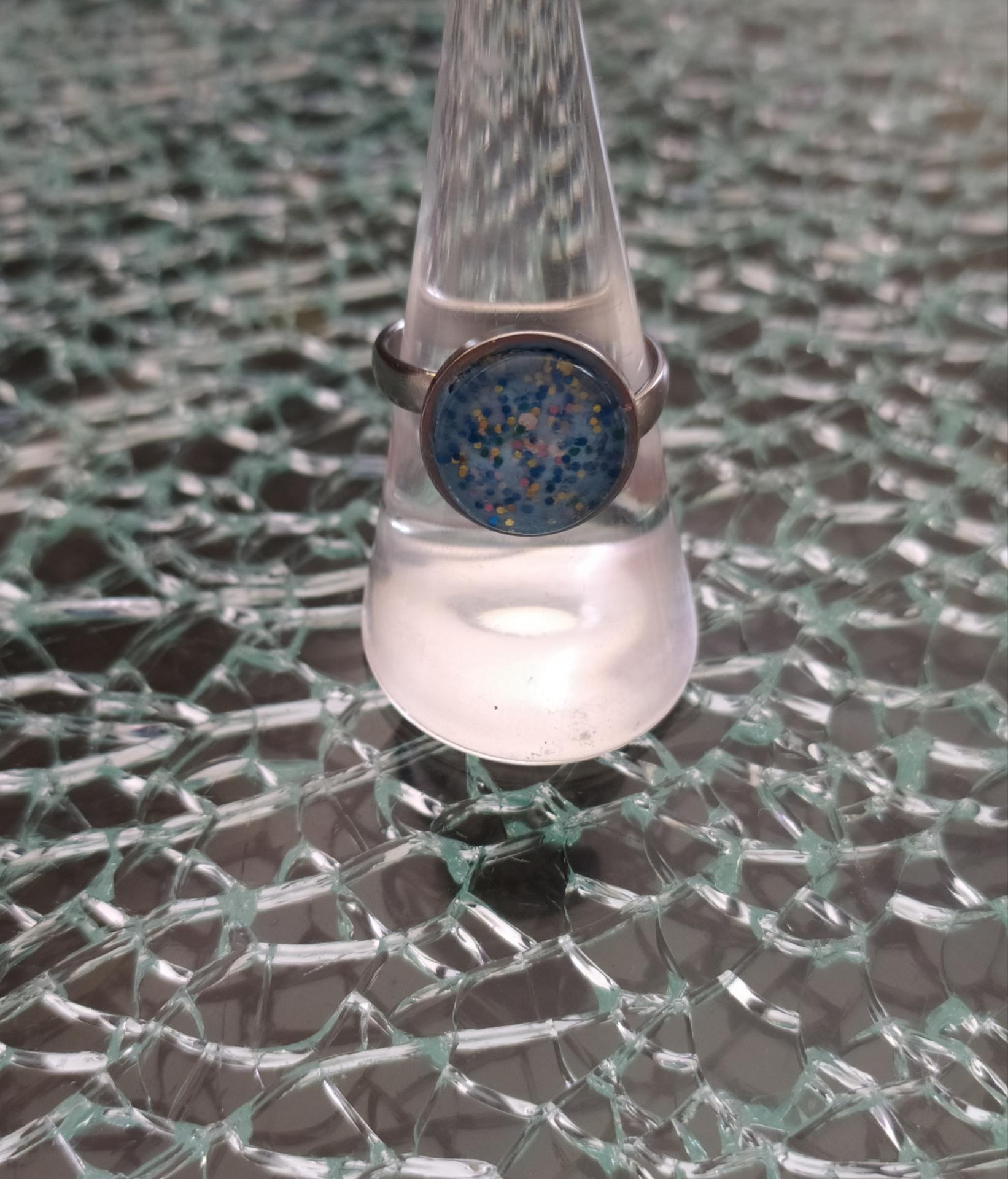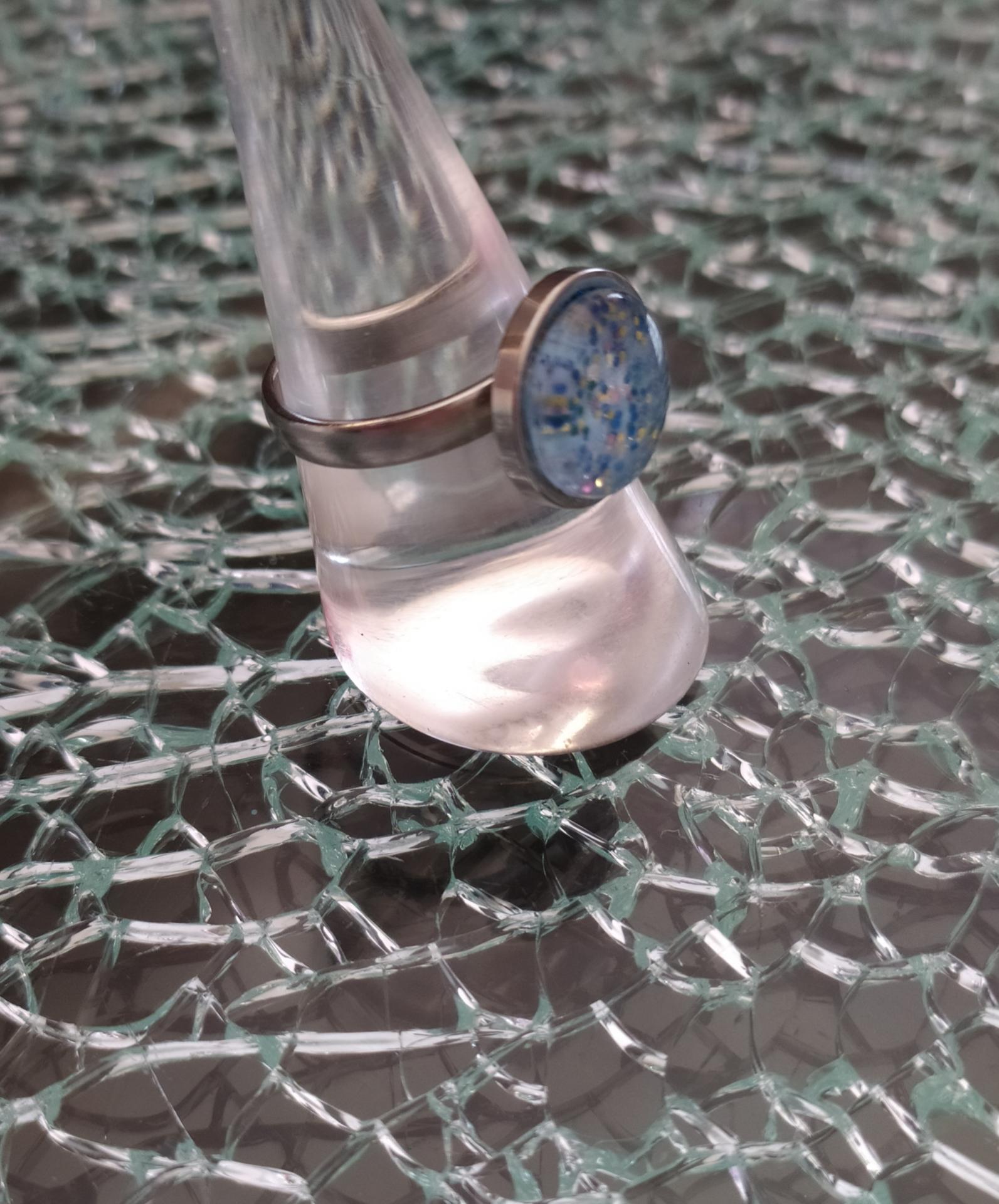 Bague, cabochon de verre rond et paillettes, acier inoxydable.